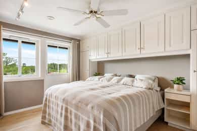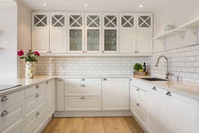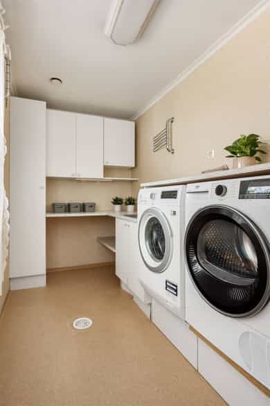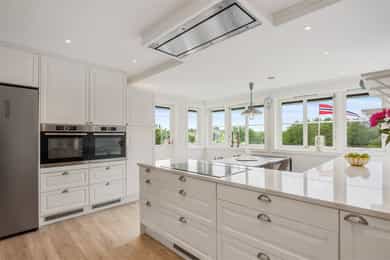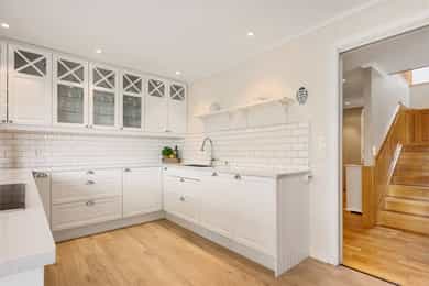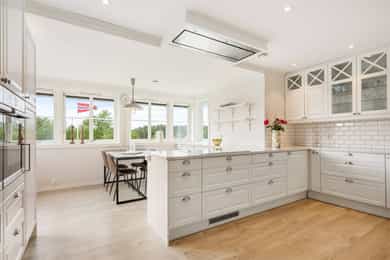 Integrerte hvitevarer medfølger: 2 kjøleskap, 1 fryser, oppvaskmaskin, kombinert mikro-/stekeovn og stekeovn.