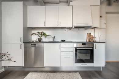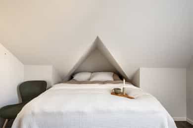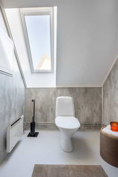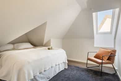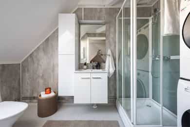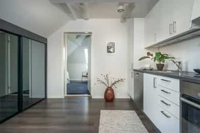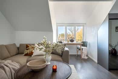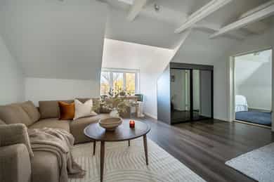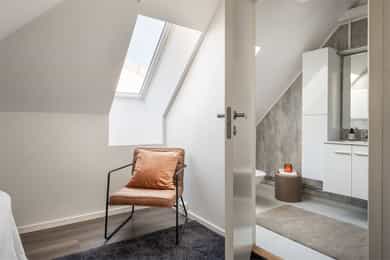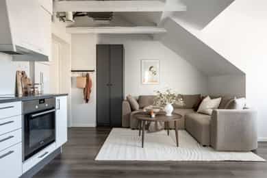 Boligen ble fullrenovert mellom 2015 og 2017. Det tekniske ble skiftet, rominndelingen ble forandret og overflatene fornyet. Nå møter vi en moderne leilighet av god standard, med smart plassutnyttelse. Rommene preges av høye skråtak og de spennende vinklene som sveitserstilen utenfor gir. Tak og vegger møtes listfritt. Bjelkene skyter ut fra skråflatene og markerer den normale takhøyden, mens taket løfter seg videre oppover på oversiden. Dette luftige forankres i en mørk, stilig laminat som pryder gulvene. Ved siden av enkelte vanlige vinduer, finner vi flere takvinduer med isolerglass og himmelutsikt. Rommene får rikelig med naturlig lys. Skråtaket medfører at det faktiske bruksarealet er ganske mye større enn det måleverdige arealet. Rommene varmes opp av varmluft fra vannbåren fjernvarme. Gangen utgjør en liten del av den åpne stue- kjøkkenløsningen. Her henger du fra deg og det henger en porttelefon på veggen. Rett frem finner sofaen sin naturlige plass, og til siden ligger kjøkkenet. Innredningen utnytter plassen elegant med rene, hvite fronter og mørk benkeplate. Komfyr og oppvaskmaskin med fronter av børstet stål matcher stålhåndtakene. Spisestuen finner rom i en egen nisje med tre deilige vinduer. Der spiser man og henter energi fra lysinnslippet, mens blikket trekkes mot Domkirkeparkens høye trekroner. Utenfor soverommet står en speilgarderobe som er imponerende tilpasset skråflatene og smelter perfekt inn i rommet. Selve soverommet er virkelig originalt med så mange rare vinkler innvendig at himlingen nesten minner om en skulptur. Håndverkerne bør høste anerkjennelse for alle de fine hjørnene, og takvinduet er spesielt nydelig. Badet har en pen og ryddig utforming — grå vinyl med oppbrett på gulvet og veggplater med betongmønster. Dusjkabinettet står fint i hjørne, og det fins opplegg til vaskemaskin. Takvinduet gir følelsen av rommet er mye større, og synet av himmelen utenfor virker oppløftende. Varmtvannet kommer forresten fra fellesberederen i kjelleren. Alt i alt er dette en leilighet du kan leve svært godt i.