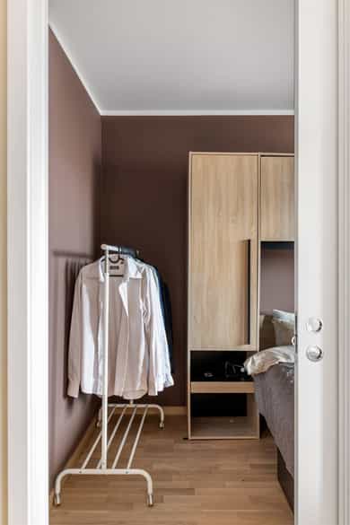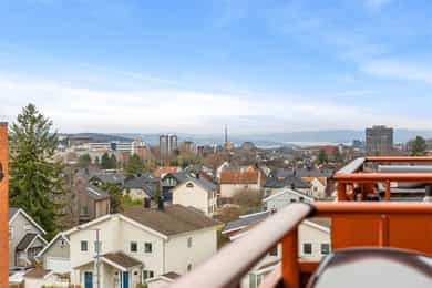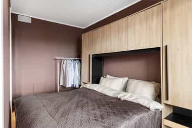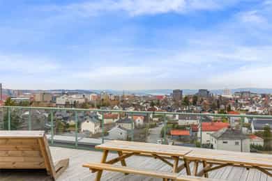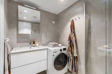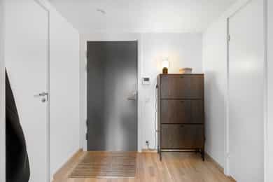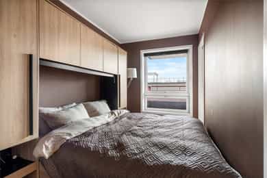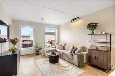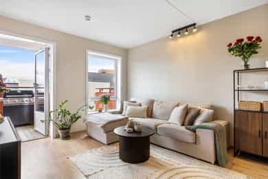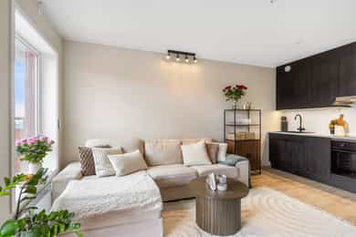Leilighet beliggende i byggets 5. etasje. Det er adkomst via heis og felles trappeoppgang. Oppgangen har callinganlegg med kamera. Leiligheten inneholder entré, baderom, bod, soverom og stue/kjøkken med utgang til balkong. Entrédøren er utstyrt med smartlås som kan betjenes via Unloc-appen. Dette gir enkel og fleksibel tilgang til leiligheten, og gjør det mulig å gi midlertidig adgang uten bruk av fysisk nøkkel. Unloc-appen kan også benyttes på dører til oppgang, garasje og borettslagets fellesarealer. ENTRÉ: Velkommen inn! Leiligheten har en innbydende entré som skaper et umiddelbart godt førsteinntrykk. LYS OG LUFTIG STUE M/UTGANG TIL BALKONG: Stuen er lys og luftig med store vindusflater som sørger for rikelig med innslipp av naturlig lys. Planløsningen åpner opp for flere møbleringsmuligheter med god plass til sofagruppe, TV-møbler og spisebord med tilhørende stoler. Gulvet er belagt med flott parkett, og overflatene er malt i delikate og moderne fargetoner. Et perfekt utgangspunkt for å innrede med egne møbler og gjenstander for å skape ditt drømmehjem. Leiligheten er utstyrt med screens på alle vinduer, som gir effektiv solskjerming og bidrar til et behagelig inneklima. Fra stuen er det utgang til en sydvendt balkong på ca. 7 m² med svært gode solforhold og flott utsikt mot fjorden. I vår- og sommerhalvåret blir balkongen en naturlig forlengelse av stuen, perfekt for hyggelige stunder med familie og venner. Her kan du enkelt skape en koselig uteoase med utemøbler, beplantning og en gassgrill. ÅPEN KJØKKENLØSNING: Stilrent kjøkken med god skap- og benkeplass. Innredningen har slette fronter og laminat benkeplate med integrert oppvaskkum og ettgreps blandebatteri. Kjøkkenet er utstyrt med integrerte hvitevarer som stekeovn, kjøl/frys, platetopp og oppvaskmaskin. Veggplate mellom overskap og benk på kjøkkenet ble montert i april 2026. Det er installert komfyrvakt og Waterguard. Avtrekk skjer via balansert ventilasjonsanlegg med sentralt mekanisk avtrekk og regulatorstyring til spjeld i kjøkkenviften. Benkeplaten på kjøkkenet er en oppgradering utover opprinnelig standard, valgt som tilvalg før oppføring av leiligheten. SOVEROM: Soverommet er romslig, med plass til dobbeltseng, nattbord og tilhørende møbler. Soverommet har en plassbygget garderobeløsning som utnytter rommet optimalt. Skapet strekker seg langs hele veggen og har gode oppbevaringsmuligheter med hyller, noe som gir praktisk og oversiktlig oppbevaring. BADEROM: Delikat, flislagt baderom med downlights i himlingen og vannbåren gulvvarme. Badet er utstyrt med veggmontert toalett, dusjhjørne med vegg/dør i herdet glass, samt servant med skap, speil og belysning. Det er opplegg for vaskemaskin. Boligen har balansert ventilasjonsanlegg, med avtrekksventil ved dusjsonen og tilluftsspalte under dørbladet. INNVENDIG BOD: Leiligheten har en praktisk innvendig bod med god plass til klær, sko og annet utstyr. Denne boden gjør det enkelt å holde boligen ryddig og organisert, samtidig som du har lett tilgang til alt du trenger. OPPBEVARING: Leiligheten disponerer en kjellerbod på ca. 4 kvm, merket med nr. 42. Det gjøres særskilt oppmerksom på at bod som er medtatt som BRA-e og i totalt BRA ligger på fellesareal, men disponeres av denne leiligheten. ØVRIG INFORMASJON: Entrédør: Entrédør med dørkikkert, brann og lydklassifisert. B30/40dB. Vinduer: Malte trevinduer med 3-lags isolerglass. Balkongdør: Malt tre med utgang fra stue, med 3-lags glass. Innerdører: Innvendig slette hvitmalte lettdører i trekarm. Slette skyvedører til soverom, og mellom entré og stue. Ventilasjon: Balansert ventilasjon. Det er sprinkleranlegg i boligen. Elektrisk anlegg: Automatsikringer i sikringsskap med hovedsikring/lastbryter på 63 Amp. Sikringsskap er montert i boden. Oppvarming: Det er oppvarming med radiatorer og vannbåren gulvvarme på bad, via sentralfyring i sameiet. Radiatorer er plassert under vinduer i oppholdsrom.