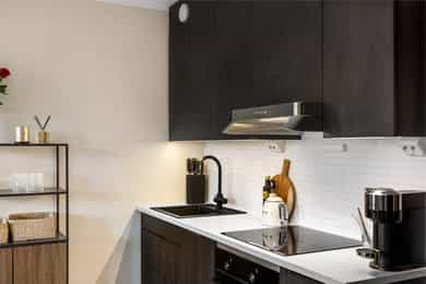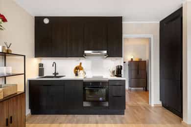 Integrerte hvitevarer medfølger, herunder kombiskap (kjøl og frys), komfyr, platetopp ogoppvaskmaskin.