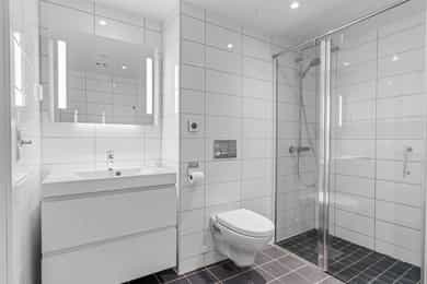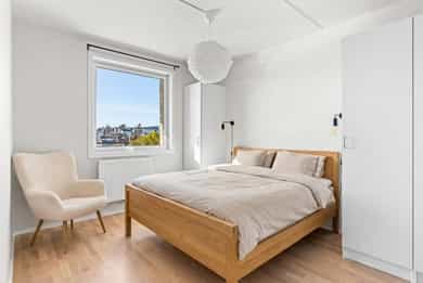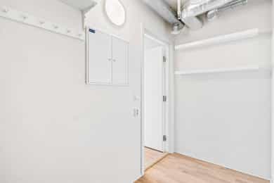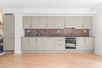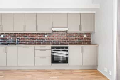 Entré Det er adkomst via trapp eller heis til leilighetsplan. Entréen som gir god plass til både sko, yttertøy og annet tilbehør. Her kan du enkelt plassere en oppbevaringsbenk, skohylle eller en garderobeskap for å holde orden. Entréen har en lys og åpen atmosfære, noe som gir et godt førsteinntrykk av resten av boligen. Leiligheten har parkett i alle rom. Stue Innbydende og luftig stue med åpen løsning mot kjøkkenet. Stuen har store vindusflater og utgang til vestvendt uteplass. Det er god plass til å møblere med sofa og tilhørende møblement. Flatene er tilsvarende som i entréen. Kjøkken Stilren kjøkkeninnredning som kler resten av rommet godt. Innredningen er fra HTH og består av glatte fronter samt laminat benkeplate. Hvitevarene er integrerte og består av induksjonstopp, stekeovn, oppvaskmaskin og kjøleskap med frysedel. Bad Badet er delikat innredet med tidsriktige fliser, downlights i himling og gulvvarme. Innredningen består av et hvitt vegghengt servantskap med skuffer og speil med belysning. Videre har badet vegghengt toalett og dusjnisje med innfellbare glassdører. Det er opplegg for vaskemaskin og tørketrommel. Soverom og lagring Soverommet har god størrelse og det er god plass til dobbeltseng med tilhørende møblement. For ekstra oppbevaringsbehov er det tilgang til en innnvedig bod eller kjellerbod på 5 kvm.