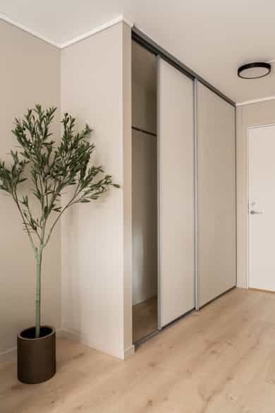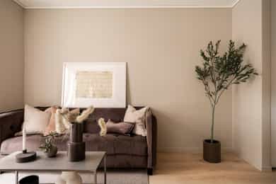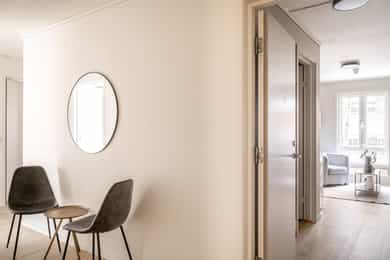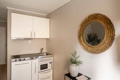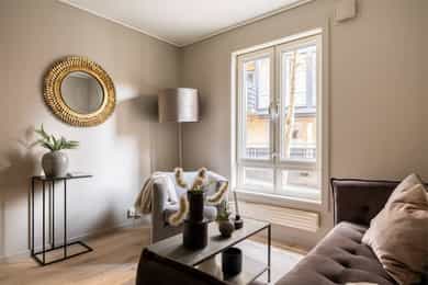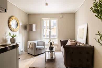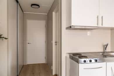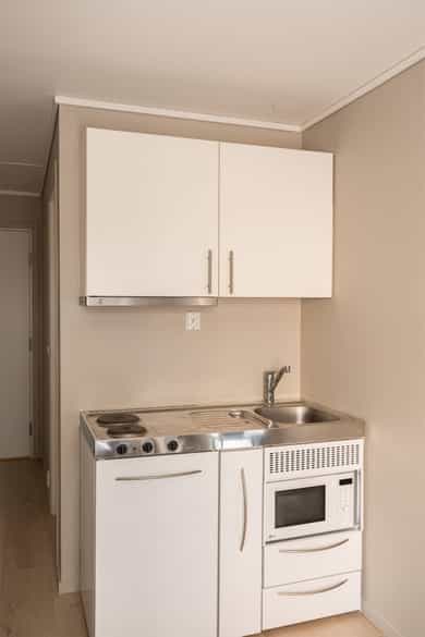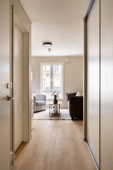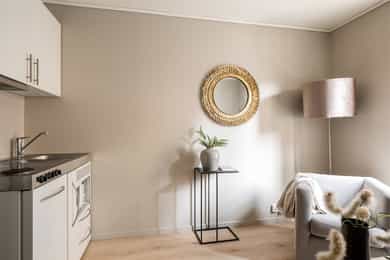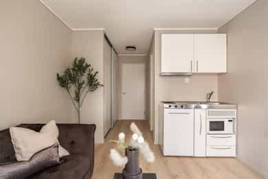Entré: Vel inne blir man møtt av en innbydende entré som gir et godt førsteinntrykk. Entréen er praktisk utformet med god plass til garderobe og oppbevaring. Stue/kjøkken: Lys og koselig stue med store vindusflater som sikrer gode lysforhold. Rommet er moderne og delikat, med lyse fargevalg på vegger og nytt laminatgulv. Planløsningen gir rom for møblering etter eget ønske. Rommet varmes opp med radiatorvarme fra et vannbårent fellesanlegg. Kjøkkenkroken har en praktisk og plassbesparende løsning. Innredningen består av glatte fronter og er utstyrt med kjøleskap, mikroovn, vask, kokeplater og mekanisk avtrekk med kullfilter over stekesonen. Bad: Lekkert bad fra 2025 med moderne fliser og fargevalg. Badet er innredet med servantskap med skuffeseksjon, speilskap, gulvmontert toalett og dusjnisje med forheng. Rommet varmes opp med radiatorvarme fra et vannbårent fellesanlegg. Innvendig overflater: - Tak: Malte plater. - Vegger: Malte plater, fliser på baderom. - Gulv: Laminat, fliser baderom.