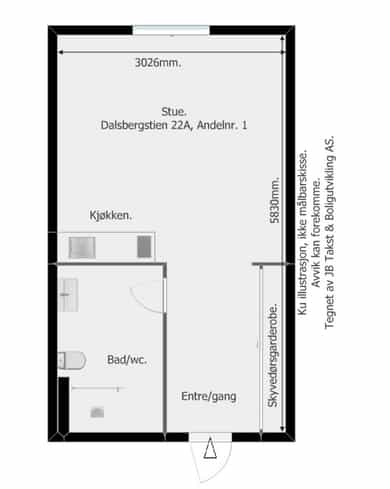 Boligen ble målt til sammen ca. 17,66m², avrundes til 18m². Yttervegger er ikke medregnet i arealet.