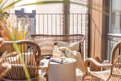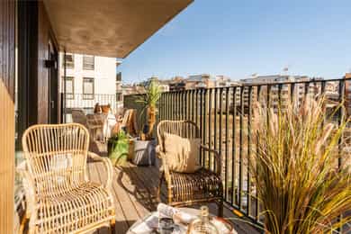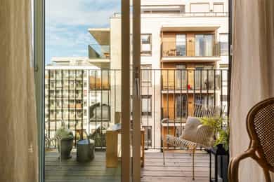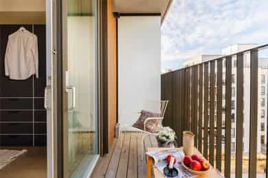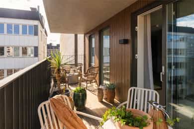 Balkong i betongkonstruksjon med adkomst fra hovedsoverommet, ca. 4 m². Terrassebord på bjelkelag. Rekkverk i metall. Rekkverkshøyden er målt til 128 cm. Skillevegg i frostet glass.