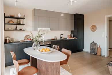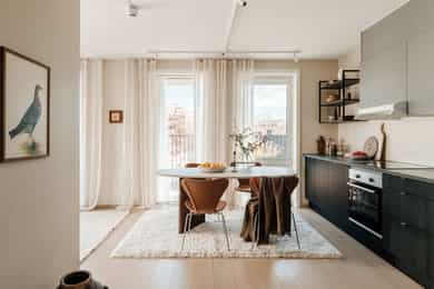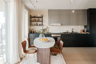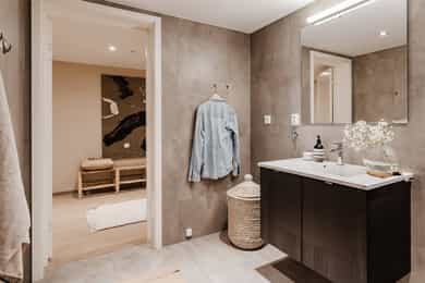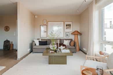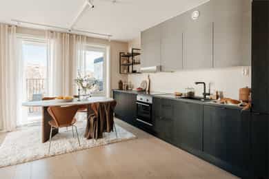 ENTRÉ Boligen ligger fint til i byggets 6. etasje, og det er heisadkomst til leilighetsplanet. Allerede ved inngangsdøren ønskes du velkommen av en innbydende og romslig entré som gir et strålende førsteinntrykk. Det er plass til garderobeskap dersom ønskelig. Hele boligen er malt i nydelige fargetoner. Gulvet er dekket med lekkert parkett med gulvvarme som går igjen i hele boligen. STUE Den lyse og hyggelige stuen byr på gode innredningsmuligheter. Stuens hjørneplassering gir en ekstra vegg med vindusflater som sørger for rikelig lysinnslipp. Rommet oppleves lyst og luftig, og kan enkelt møbleres med sofa, TV-møblement, spisebord og øvrig møblement. Fra stuen er det direkte utgang til en herlig balkong på ca. 14 m², hvor man kan nyte solen og ha god fleksibilitet mellom ute- og innerom. Balkongen har god plass til flere sittegrupper og grill, og vender ut mot grønne og naturskjønne omgivelser. KJØKKEN Lekkert kjøkken som ligger i en delvis åpen og sosial løsning mot stuen, ideelt for både hverdagsbruk og hyggelige sammenkomster. Kjøkkenet er utformet med fokus på både funksjonalitet og stil, og det er godt med skap- og benkeplass. Kjøkkeninnredningen har moderne, mørke fronter og laminert benkeplate. Kjøkkenet er videre velutstyrt med integrerte hvitevarer som stekeovn, platetopp, oppvaskmaskin og kjøl/frys. Kjøkkenet har avtrekk via balansert ventilasjonsanlegg. BAD Lekkert bad med moderne og stilfulle farge- og materialvalg. Innredningen består av servantskap med heldekkende servant, vegghengt toalett, dusjhjørne med innfellbare dører og opplegg for vaskemaskin. Badet har behagelig gulvvarme, downlights i taket og er tilkoblet balansert ventilasjonsanlegg. SOVEROM 1 Romslig hovedsoverom med god plass til dobbeltseng og tilhørende møblement. Plassen er godt utnyttet med stort garderobeskap og vegghengt skap over sengen. Vindusflater fra gulv til tak gir et fantastisk lysinnslipp og hyggelig utsikt. Skyvedøren ut til balkongen skaper en forlengelse av rommet. Flott balkong på ca. 4 m² med plass til ulike utemøbler - et perfekt sted å starte dagen med en kopp kaffe! SOVEROM 2 Lyst og fleksibelt soverom som byr på mange muligheter, enten man trenger barnerom, gjesterom eller kontor. Rommet har plass til både seng og garderobe, og den nøytrale stilen gjør det enkelt å tilpasse etter behov. INNVENDIGE OVERFLATER: - Gulv: Innvendige gulv er belagt med en-stavs parkett. - Vegger: Sparklet og malte overflater på plater/murpuss. - Himling: Sparklet og malte plater i entré og bad. Malte betongelementer for øvrig. - Himlingshøyde ca. 2,20 m målt i entré og ca. 2,49 m i stue/kjøkken.