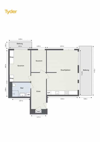 BRA-i: 72 kvm. Entré, stue/kjøkken, bad og to soverom