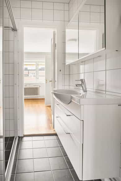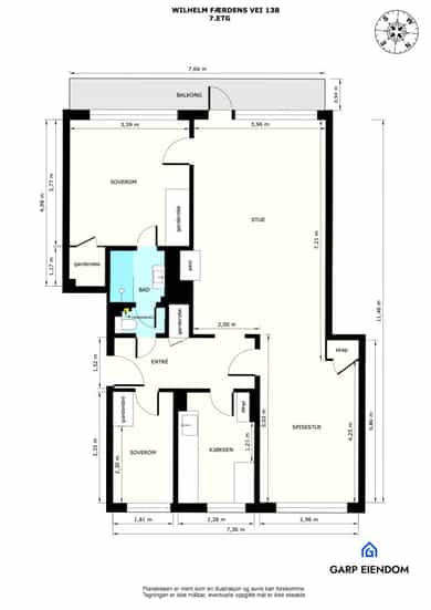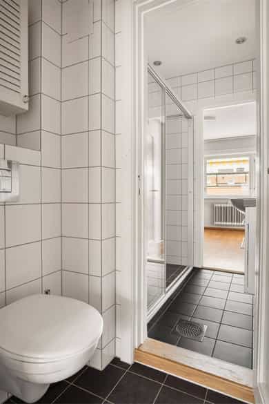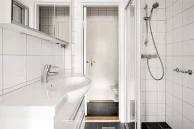 Stue: Tregulv og malt overflate på vegger. Malt overflate i himling. Radiator og peis. Utgang til balkong. Kjøkken: Tregulv og malt overflate på vegger. Malt overflate i himling. Radiator. Innredning med opplegg for vaskemaskin og opplegg for oppvaskmaskin. Spisestue: Tregulv og malt overflate på vegger. Malt overflate i himling. Radiator. Garderobeskap. Soverom 1: Tregulv og malt overflate på vegger. Malt overflate i himling. Radiator. Garderobeskap. Soverom 2: Tregulv, og malt overflate og tapet på vegger. Takess i himling. Radiator. Garderobeskap og skyvedørsgarderobe. Bad: Flis på gulv og malt glassfiberstrie på vegger. Malt overflate og downlights i himling. Gulvvarme. Utstyrt med servant, servantskap, veggmontert wc, dusjnisje, innfellbare dusjdører og naturlig avtrekk. Entre: Tregulv og malt overflate på vegger. Malt overflate i himling. Porttelefon og garderobeskap. Det er i forbindelse med salget utarbeidet en tilstandsrapport fra bygningssakkyndig. Tilstandsrapporten er en teknisk gjennomgang av boligen med oppdagede avvik. Forhold som har fått TG2 og TG3 må gjennomgås spesielt nøye, da disse indikerer avvik fra normal slitasje og/eller høy alder, med mulig behov for utbedring. Bygningsdeler som har fått TGIU er ikke undersøkt av takstmann. Bygningsdeler som har fått TG2: Balkong, terrasse, platting Oppsummering REKKVERKSHØYDE: Avstand til bakken er mer enn 10 m og det er krav om minst 120 cm rekkverkshøyde. Målt avstand er 19,01 meter til bakken. Rekkverket blir målt til 99 cm og tilfredsstiller ikke forskriftskravet på 120 cm. Ubehandlet betonggulv. Rekkverk av stål. Gulvet har avrenning i front. Anbefalte tiltak Årsak: For lavt rekkverk sammenliknet med dagens krav. Konsekvens: Fallulykker. Tiltak: For å lukke avviket må rekkverket heves til 120 cm over gulv. Vinduer og dører Oppsummering TG 2 er satt med bakgrunn i alder (isolerglass over 30år) og det vil være risiko for at vindusglass punkterer. På grunn av alder er enkelte pakninger harde/uttørket, og har følgelig en redusert tettefunksjon. Anbefalte tiltak Årsak: Alder og slitasje. Konsekvens: Ingen vesentlig konsekvens. Påregn større varmetap sammenliknet med nyere vinduer. Tiltak: Det er ikke behov for strakstiltak men anbefaler utskifting av vinduer innen 3-5 år. Dette er normalt sameiet/borettslaget sitt ansvar. Etasjeskille og gulv på grunn Oppsummering 7. ETASJE Entrè: Lokal planhet målt med 50 cm avstand fra døren og mot midten av rommet: 0 mm (dør), 0 mm, 1 mm, 2 mm, 3 mm. Lokalt avvik: 3 mm. Total planhet målt ved veggene: 0 mm (dør), 3 mm (venstre), 1 mm (rett frem), 0 mm (høyre), 1 mm (midt på gulvet). Totalt avvik: 3 mm. Stue: Lokal planhet målt med 50 cm avstand fra døren og mot midten av rommet: 0 mm (dør), 0 mm, 2 mm, 2 mm, 2 mm. Lokalt avvik: 2 mm. Total planhet målt ved veggene: 0 mm (dør), 0 mm (venstre), 17 mm (rett frem), 10 mm (høyre), 11 mm (midt på gulvet). Avvik: 17 mm. UTFØRELSE AV KONTROLLEN: Det kontrolleres 2 rom pr etasje og linjelaser anvendes for å måle høydeforskjellene. Lokal planhet måles med 5 punkter fra inngangen til rommet og 2 meter rett frem. Totalt planhet måles ca på midten av hver vegg og midt i rommet. Rutinemessig måles vegger fra venstre når man kommer inn i rommet. I tillegg måles midt på gulvet. Lasermåler plasseres i døråpningen og målinger høyere enn referansepunktet markeres med negativt fortegn. Målinger lavere enn referansepunktet har positivt fortegn. VURDERINGSKRITERIER: Følgende vurderingskriterier er hentet fra Norsk Standard for tilstandsvurdering av boliger (NS3600). Tilstandsgrad 2: Nivåforskjell mellom rommene observert. Lokalt avvik 10 til 20mm. Totalt avvik 15 til 30mm. Tilstandsgrad 3: Sterke rystelser. Store sprekker mellom gulvlist og gulv. Lokalt avvik >20 mm. Totalt avvik >30 mm Anbefalte tiltak Ikke behov for umiddelbare tiltak men ved evt. legging av nytt gulv som stiller krav til planhet av underlaget, må tiltak påregnes. Kjøkken Oppsummering av overflater og innredning Kjøkkeninnredning med slette fronter og benkeplate med nedfelt oppvaskkum av stål. Frittstående komfyr og kjøleskap (medfølger ikke). Frittstående oppvaskmaskin og vaskemaskin medfølger. TG2 settes pga manglende lekkasjesikring under kjøkkenbenken, og generelt behov for oppgradering. Anbefalte tiltak overflater og innredning Anbefaler å installere magnetventil (waterguard e.l.) under kjøkkenbenken. Denne vil fungere som et forebyggende tiltak og kutte vanntilførselen dersom det oppstår vannlekkasje fra kjøkkenet. Innredning og kjøkkenet anbefales oppgradert. Oppsummering av avtrekk TG2 settes pga kullfiltervifte. Når boligen har kun naturlig ventilasjon og ikke avtrekk over stekesonen til friskluft er dette et avvik. Konsekvens vil være utilstrekkelig luftutveksling. Anbefalte tiltak avtrekk Mekanisk avtrekk over stekesonen anbefales etablert. Avløpsrør Oppsummering Det registreres tilfredsstillende avrenning fra servant og sluk. Soilrør bad: Ingen merknader. Soilrør kjøkken: Tilstandsgrad 2 settes på grunn av alderen. Vær oppmerksom på at utskifting og rehabilitering av soilrør ofte er borettslag/sameiets ansvar. Soilrøret som strekker seg mellom etasjene er ikke mulig å kontrollere fullstendig siden de er innkasset. Det er ikke tegn etter lekkasjer eller skader på avløpsrørene på befaringstidspunkt. Anbefalte tiltak Årsak: Mer enn halvparten av forventet brukstid er oppbrukt på det ene (av 2) soilrør i leiligheten. Konsekvens: Ingen vesentlig konsekvens. Tiltak: Det er ikke behov for utbedringstiltak siden anlegget fungerer i dag, men ut ifra alder kan skader plutselig oppstå på eldre anlegg. I forbindelse med oppgradering av kjøkken vil det være naturlig med utskiftning av rør. Vannledninger Oppsummering Stoppekran plassert bak inspeksjonsluke på bad. Røropplegg er koplet i veggen og er synlig for kontroll via inspeksjonsluke. I dag er det krav om at koplinger og stop