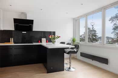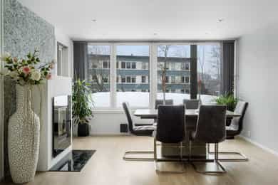 Boligen rom for rom: Entré: Lys og praktisk entré som gir et godt førsteinntrykk. Plass til sko og yttertøy i en skyvedørsgarderobe, med enkel tilgang til alle rom. Boligen har callingsystem. Stue: Stuen er romslig, med store vindusflater som slipper inn godt med dagslys og gir en luftig følelse. Peisen tilfører varme og en behagelig stemning. Det er plass til både sofagruppe, spisebord og annet møblement. Fra stuen er det direkte utgang til en romslig balkong som fungerer som en naturlig forlengelse av oppholdsrommet. Balkongen gir gode muligheter for å innrede med ulike typer utemøbler, som en liten spiseplass eller en komfortabel sittegruppe, og blir et hyggelig sted å trekke seg tilbake med en kopp kaffe eller nyte solrike dager. Kjøkken: Kjøkkenet har en stilren innredning med glatte fronter og en slitesterk komposittbenkeplate med støpt oppvaskkum. Granitt og fliser mellom benk og overskap gir et rent og elegant uttrykk. Det er godt utstyrt med integrerte hvitevarer: stekeovn, mikrobølgeovn, kjøleskap, fryseskap og oppvaskmaskin. Videre har kjøkkenet nedfelt induksjonstopp med kullfilterventilator, samt Waterguard og komfyrvakt for ekstra sikkerhet. Kjøkkenet har også god plass til en spisedel med bord og stoler, noe som gjør det enkelt å samle familie eller gjester til måltider og hyggelige stunder. Bad: Moderne bad fra 2025. Det er flislagt og har elektriske varmekabler. Innredningen består av servant med underskap, vegghengt toalett, dusjhjørne og speil med belysning. Badet har mekanisk ventilasjon og praktiske løsninger som gjør det både funksjonelt og stilrent. Soverom: Boligen har to gode soverom med fleksible bruksmuligheter. Hovedsoverommet er romslig med plass til dobbeltseng, nattbord og garderobeløsning, mens det andre soverommet egner seg perfekt som barnerom, gjesterom eller hjemmekontor. Begge rommene har gode lysforhold. _______ Tekniske installasjoner: Naturlig ventilasjon. Tilluft fra spalteventiler i vinduene. Bereder på 120 liter i kjøkkenbenken. Elektrisk oppvarming av boligen. Automatsikringer med jordfeilautomater fra 2017 og el-anlegg ellers i boligen i 2017. Boligen er utstyrt med røykvarsler og 6 kg pulverapparat.