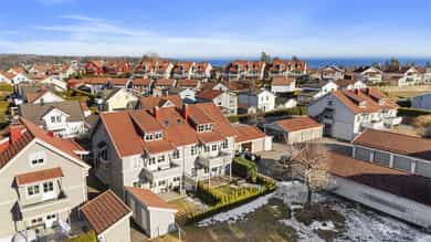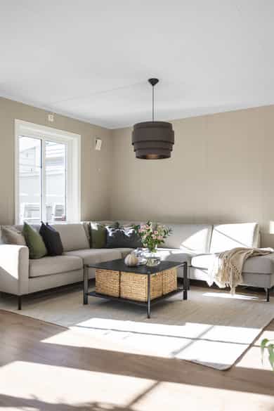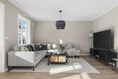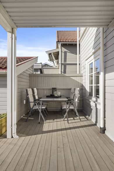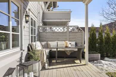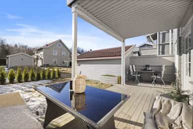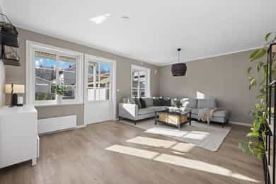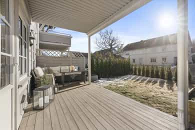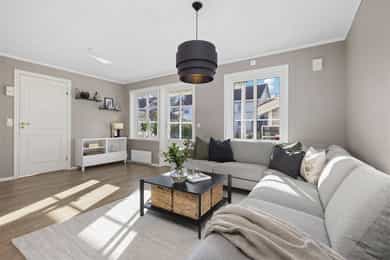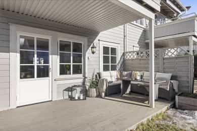 Her bor du svært solrikt! På den sørvestvendte terrassen og i hagen har du direkte sol fra ca. kl. 11:00 helt til kl. 20:00 i sommermånedene. På vinterstid trekker solen lenger inn i stuen, noe som skaper en lun og lys atmosfære inne.