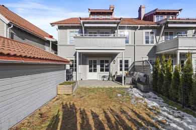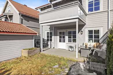 Eiendommen har en fin og barnevennlig beliggenhet med en pent opparbeidet hage og en stor, sørvestvendt terrasse på ca. 18 kvm. Her ligger alt til rette for hyggelige sommerdager i solrike omgivelser. Hagen er hovedsakelig opparbeidet med gressplen, perfekt for lek og aktivitet, og er i utgangspunktet fellesareal. Her har du gode solforhold med sol fra rundt kl 11:00 til ca 20:00 om sommeren!