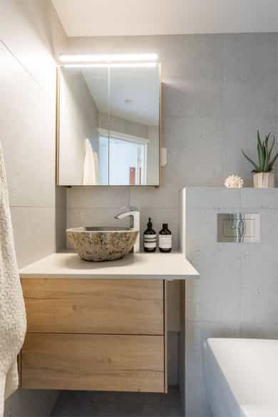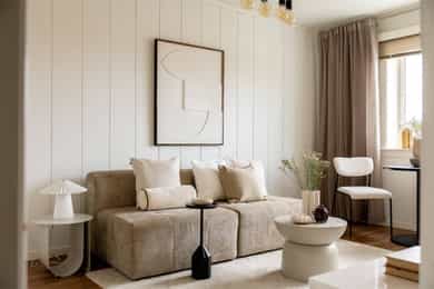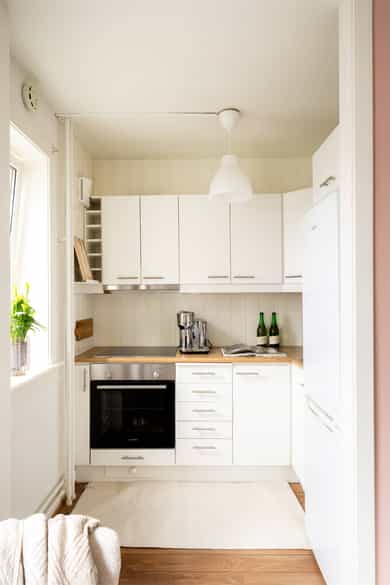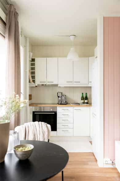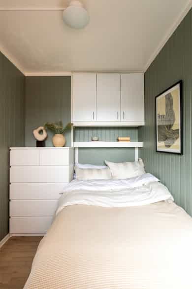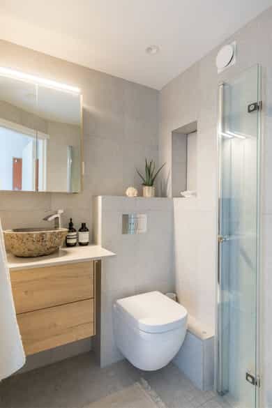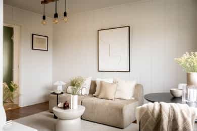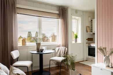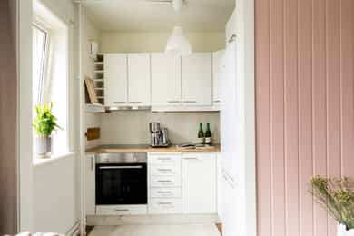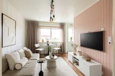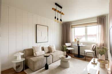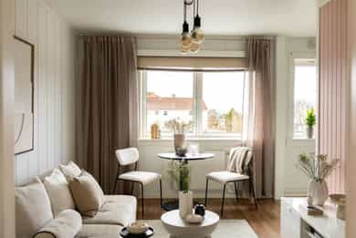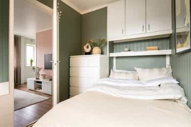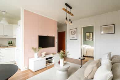 Entré Entréen fremstår lys og praktisk med gode oppbevaringsmuligheter i integrert garderobeskap. Rommet gir et ryddig og innbydende førsteinntrykk av boligen. Det er plass til oppbevaring av yttertøy og sko. Det er parkettgulv i leiligheten. Stue Stuen fremstår som lys og innbydende med gode vindusflater som slipper inn rikelig med naturlig lys. De rolige fargetonene gir rommet en harmonisk og behagelig atmosfære. Planløsningen gir plass til både sofa, tv-bord og spiseplass. Rommet oppleves luftig og funksjonelt med gode møbleringsmuligheter. Dette er en hyggelig stue som egner seg godt til både avslapning og sosiale sammenkomster. Kjøkken Lyst og fint kjøkken med slette, lyse fronter som gir et tidløst preg. Over- og underskap gir gode oppbevaringsmuligheter, og laminat benkeplate gir en praktisk arbeidsflate. Kjøkkenet er utstyrt med integrert stekeovn fra 2025, platetopp, samt frittstående kjøle- og fryseskap. Det er kjøkkenventilator med kullfilter. Soverom Pent og innbydende soverom i en delikat fargetone som gir en rolig atmosfære. Plassbygde skap og hyller gir gode oppbevaringsmuligheter. Soverommet har god plass til en romslig seng, nattbord og kommode. Bad Badet ble totalrehabilitert i 2023, og fremstår moderne og stilrent med flislagte overflater på vegger og gulv. Innredningen består av servant, skap med speil og belysning, og veggehengt toalett. Dusjen er plassert i hjørnet med innfellbare dusjdører. Elektriske varmekabler i gulvet sørger for god komfort. Badet ventileres via en ventil som er tilkoblet det mekaniske avtrekkssystemet, samt en tilluftspalte under dørbladet.