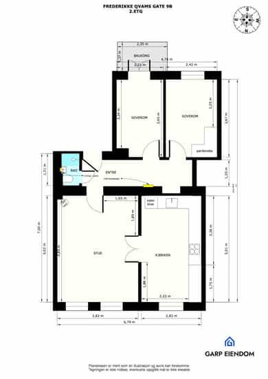 2.etasje - Leiligheten består av: Entré, stue, kjøkken, 2 soverom og bad. Balkong fra soverom. Leiligheten disponerer i tillegg kjellerbod på 6kvm, loftsbod på 3kvm og lagringsbod i trappegang på 1kvm.