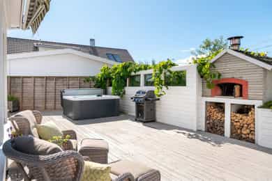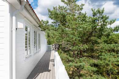 Innkjørselen og gårdsplassen er opparbeidet med asfalt og stein, som gir både et ryddig uttrykk og praktiske parkeringsmuligheter. Rundt boligen finner du flere solrike terrassearealer - perfekt for lange sommerdager med familie og venner. Terrassene bindes sammen av tretrapper, og gir en naturlig flyt mellom hus, hage og uteområder.