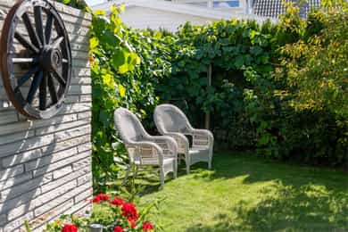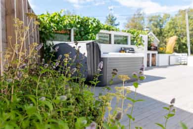Hagen byr på frodige busker, klatreplanter og lune kroker hvor du kan trekke deg tilbake med en bok eller en kaffekopp. Her finner du også plass til grill, pizzaovn, sittegrupper og boblebad - med privatliv og ro i grønne omgivelser. I hagen finner du druplanter, rips, bringebær, kirsebær og stikkelsbær – et lite spisskammers hvor du kan plukke dine egne bær og frukt. Synlig fjell i dagen og naturtomt gir stedet et ekte Hvaler-preg, der natur og bebyggelse smelter sammen på en harmonisk måte.
