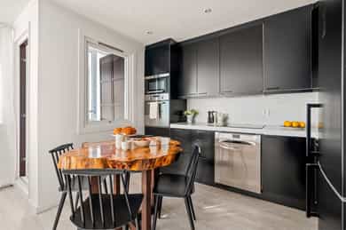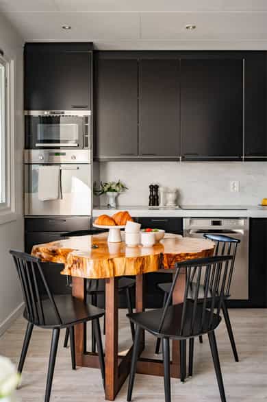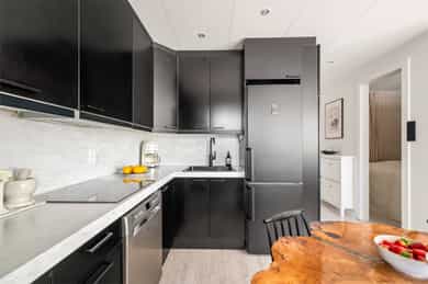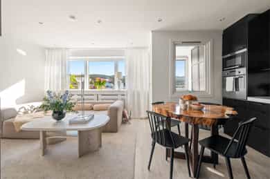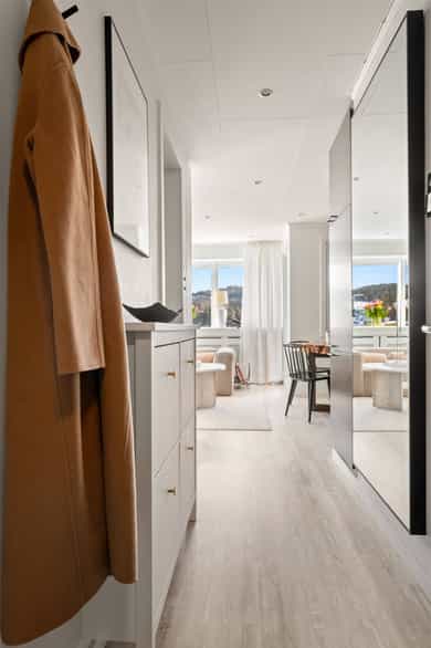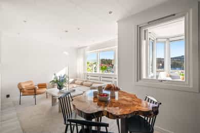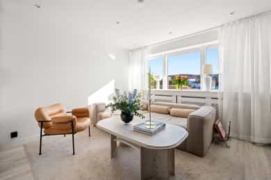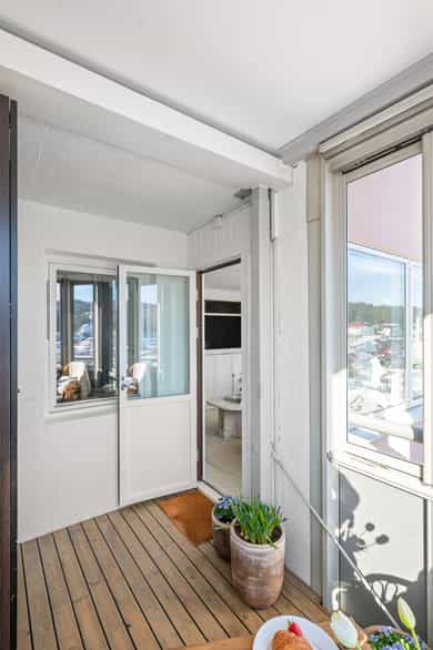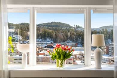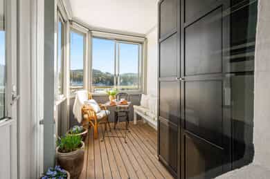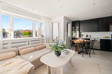 Stue: Lys og romslig stue med store vindusflater i flere retninger som gir svært gode lysforhold, flott utsikt og lite innsyn. Fra stuen er det utgang til balkong. Gode møbleringsmuligheter med plass til sofaseksjon med tilhørende møblement samt spisebord. Stilren, plassbygd innredning fra 2021. Kjøkkenet ligger i åpen løsning mot stuen, noe som gir en sosial og luftig planløsning. Sovealkove: Praktisk sovealkove etablert med lettvegger i tilknytning til stuen. Alkoven har plass til dobbeltseng samt integrert garderobeskap for oppbevaring. Innglasset balkong: Romslig, innglasset balkong på ca. 7 kvm med utgang fra stuen. Her kan utsikten nytes året rundt, og det er god plass til utemøbler. Terrassegulvet er slipt og oljet etter 2021. Det medfølger også et stort garderobeskap som gir gode oppbevaringsmuligheter. Kjøkken: Pent kjøkken med mørke, glatte fronter og laminat benkeplate med nedfelt vaskekum. God skap- og benkeplass. Integrert koketopp, stekeovn og oppvaskmaskin. Kullfilterventilator over kokeplass. Waterguard montert. Bad: Pent og tidsriktig bad med baderomsinnredning med oppbevaring, vegghengt speilskap med belysning og dusjhjørne med svingbare glassdører. Flislagt gulv med elektrisk gulvvarme og flislagte vegger. Malt himling. Elektrisk styrt vifte med tilluft fra spalte i dør. Entré: Innbydende entré med god plass til oppheng av yttertøy og oppbevaring av sko. Stor skyvedørsgarderobe med speilfronter gir gode oppbevaringsmuligheter. Dørtelefon ved inngangsdøren. Tilstandsrapport for boligen er vedlagt salgsoppgaven. Se denne for nærmere informasjon om tilstandsgrad.