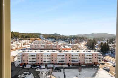 Arealeffektiv utsiktsleilighet i 10. etg med heis, lukket alkove og moderne bad. Innglasset balkong og parkeringsplass