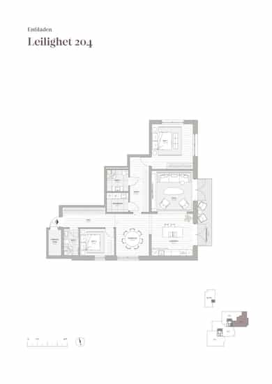 Leilighet 204 er en særdeles vakker endeleilighet med rikelig med lysinnslipp og høy kvalitet i materialvalg og utforming. Leiligheten ligger i 2. etg med heisadkomst.