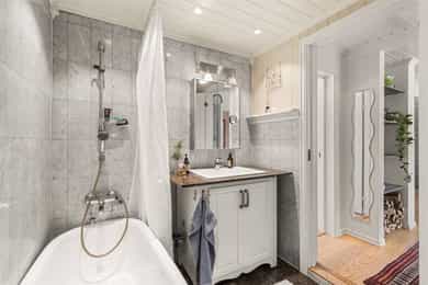 Tomannsbolig oppført i tre over grunnmur i 1939 og senere både til-/ombygd bla.a. i 2014 Boligen er oppført i to etasje samt kjeller/underetasje og loft. Utført fuktsøk ved hjelp av fuktindikator i tilknytning til bad i 1. etasje samt utført hulltaking i vegg fra tilliggende soverom og inn bak badekar/våtsone. Ingen unormale forhold vedrørende fukt påvist. Tilnærmet flat gulvkonstruksjon uten fall til sluk. Selger opplyser at rommet er fra ca 2000. Utført fuktsøk på tilsvarende måte i tilknytning til bad i 2. etasje (unntatt hulltaking). Ingen unormale forhold vedrørende fukt påvist. Selger opplyser at rommet er fra ca 2005. Det bør installeres dusjkabinett så lenge rommet har sin nåværende utførelse. Utført fuktsøk på tilsvarende måte i tilknytning til bad i underetasje hybel (unntatt hulltaking). Ingen unormale forhold vedrørende fukt påvist. Sprekk/riss i diverse fliser. Tilnærmet flat gulvkonstruksjon uten fall til sluk. Selger opplyser at rommet er fra ca 2000. Selger opplyser om følgende: - Det har vært lekkasje fra tak ved et par anledninger. - Det var lekkasje fra bad i 2. etasje ca 2005. Utbedret i samarbeid med forsikringsselskap. - Det var vannskade i kjeller i 1997. Utbedret i samarbeid med forsikringsselskap. - Det var lekkasje fra kjøkken ca 2012. Utbedret i samarbeid med forsikringsselskap. - Det var lekkasje fra luftekanal til bad i 1. etasje. Utbedret. - Det har tidvis vært sukkermaur om våren/sommeren. - Det var råteskader i deler av bjelkelag. - Det er råte i deler av bjelker ved krypeloft over 1. etasje. - Det kan forekomme noe lydgjennomgang mellom etasjene men at dette ikke oppleves som sjenerende. Utvendig. Valmet takkonstruksjon i tre. Bordtak som undertak. Taket er tekket med betongtakstein. Dels flat/gjenbygd takkonstruksjon (over del av 1. etasje). Konstruksjonen er tekket med folie/Sarnafil eller tilsvarende. Konstruksjonen er kun vurdert fra bakkenivå av sikkerhetsmessige årsaker. Takrenner/beslag i stål. Yttervegger i bindingsverk av tre. Utvendig kledd med liggende kledning. Vinduer i tre bla.a. fra 1990/2000/-2012/-14. Ytterdører i tre/plast bla.a. fra 2014/-19. Verandaer i tre. Dels med rekkverk i stål og glass og dels i tre. Utvendig trapp i tre (2. etasje). Tekniske installasjoner. - Innvendige vannledninger i kobber bla.a. fra ca 2000 og ca 2012. - Innvendige avløpsledninger i plast bla.a. fra ca 2000 og ca 2012. - Ventilering via luftespalte i flere vinduer, ventil i enkelte rom samt avtrekk fra kjøkken. - Oppvarming dels med varmekabler, panelovner og ved. - Varmtvannsbereder på 198 l. - Hovedsikring 63/50 A. El-billader 32 A. Teknisk 25/20 A. Øvrige kurser 16/15/13/10 A. Anlegget er utstyrt med automatsikringer. -Røykvarslere og håndslukkerapparat. Tomteforhold. Byggegrunn av fjell/stein. Selger opplyser at det ble drenert (innvendig) mot vest i 1999 grunnet fukt i kjeller. Grunnmur i betong eventuelt med sparestein/Lecablokker. Skrånende tomt. Utvendige avløpsledninger i plast fra ca 2010 i flg. eier. Det er usikkerhet om avløpsledning mellom septiktank og grunnmur også ble skiftet ca 2010. Offentlig vann-/avløp via private stikkledninger. Nedgravd septiktank (benyttes antatt kun som koplingspunkt). I forbindelse med salget er det utarbeidet en tilstandsrapport for boligen som viser boligens tilstandsgraf fra TG1-TG3, hvor TG1 er velfungerende forhold, TG2 er forhold som må påregnes utbedret på sikt, og TG3 er forhold som må påregnes utbedret omgående. Følgende forhold er kommentert med TG2: Utvendig > Taktekking Utvendig > Nedløp og beslag Utvendig > Veggkonstruksjon Utvendig > Takkonstruksjon/Loft Utvendig > Vinduer - 2 Utvendig > Balkonger, terrasser og rom under balkonger Innvendig > Overflater Innvendig > Rom Under Terreng Innvendig > Andre innvendige forhold Tekniske installasjoner > Ventilasjon Tekniske installasjoner > Varmtvannstank Tekniske installasjoner > Varmtvannstank - 2 Tekniske installasjoner > Elektrisk anlegg Tomteforhold > Drenering Tomteforhold > Grunnmur og fundamenter Tomteforhold > Terrengforhold Våtrom > Kjeller/underetasje > Vaskerom > Sluk, membran og tettesjikt Våtrom > Kjeller/underetasje > Vaskerom >Ventilasjon Våtrom > Kjeller/underetasje > Bad/wc/vaskerom (hybel) > Overflater vegger og himling Våtrom > Kjeller/underetasje > Bad/wc/vaskerom (hybel) > Overflater Gulv Våtrom > 1. Etasje > Bad/wc > Overflater Våtrom > 1. Etasje > Bad/wc > Sluk, membran og tettesjikt Våtrom > 2. Etasje > Bad/wc/vaskerom > Overflater vegger og himling Våtrom > 2. Etasje > Bad/wc/vaskerom > Overflater Gulv Våtrom > 2. Etasje > Bad/wc/vaskerom > Sluk, membran og tettesjikt Følgende forhold er kommentert med TG3: -Utvendig > Nedløp og beslag - 2: Utvendige beslagsløsninger er ikke fagmessig utført. Beslag er ikke ført inn - under - og opp bak kledningsbord. -Utvendig > Utvendige trapper: Det er ikke montert rekkverk. -Innvendig > Etasjeskille/gulv mot grunn: Målt høydeforskjell på over 15 mm gjennom hele rommet. Tilstandsgrad 2 gis med bakgrunn i standardens krav til godkjente måleavvik. Målt høydeforskjell på over 20 mm innenfor en lengde på 2 meter. Tilstandsgrad 3 gis med bakgrunn i standardens krav til godkjente måleavvik. Målt høydeforskjell på mellom 10 - 20 mm innenfor en lengde på 2 meter. Tilstandsgrad 2 gis med bakgrunn i standardens krav til godkjente måleavvik. Målt høydeforskjell på over 30 mm gjennom hele rommet. Tilstandsgrad 3 gis med bakgrunn i standardens krav til godkjente måleavvik. Målt høydeforskjell/planavvik på ca 20 mm innenfor en lengde på 2 m og ca 25 mm i hele rommet i kjøkken og stue i 1. etasje. Målt høydeforskjell/planavvik på ca 25 mm innenfor en lengde på 2 m og ca 45 mm i hele rommet i soverom nordøst i 2. etasje. Målt høydeforskjell/planavvik på ca 35 mm innenfor en lengde på 2 m og ca 35 mm i hele rommet i stue i 2. etasje. Målt høydeforskjell/planavvik på mindre enn ca 10 mm i hybel i underetasje. R