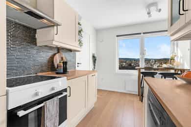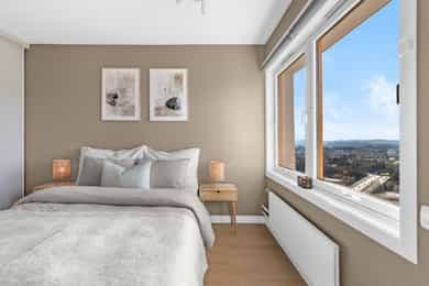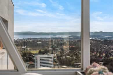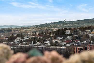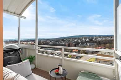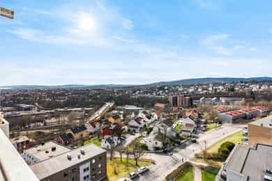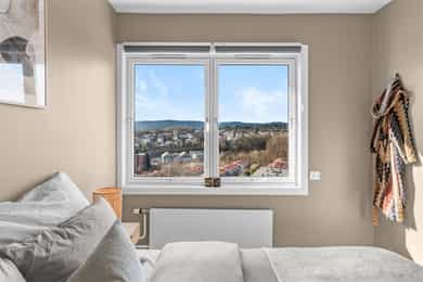 Leilighet beliggende i byggets 11. etasje. Det er adkomst via heis og felles trappeoppgang. Oppgangen har porttelefon. Leiligheten inneholder entré, bod, bad, soverom, kjøkken og stue med utgang til balkong. ENTRÉ: Velkommen inn! Leiligheten har en innbydende entré som skaper et umiddelbart godt førsteinntrykk. LYS OG LUFTIG STUE M/UTGANG TIL BALKONG: Stuen er lys og luftig med store vindusflater som sørger for rikelig med innslipp av naturlig lys. Planløsningen åpner opp for flere møbleringsmuligheter med god plass til sofagruppe, TV-møbler og spisebord med tilhørende stoler. Gulvet er belagt med flott laminat og overflatene er malt i delikate og moderne fargetoner. Et perfekt utgangspunkt for å innrede med egne møbler og gjenstander for å skape ditt drømmehjem. Fra stuen er det utgang til en herlig, nordvestvendt balkong på ca. 8 m² med storslått utsikt over Oslofjorden i syd til Holmenkollen i vest. I vår- og sommerhalvåret blir balkongen en naturlig forlengelse av stuen, perfekt for hyggelige stunder med familie og venner. Her kan du enkelt skape en koselig uteoase med utemøbler, beplantning og en gassgrill. KJØKKEN: Moderne kjøkken med god skap- og benkeplass. Kjøkkeninnredning med profilerte fronter og heltre benkeplate med nedfelt vask. Det er opplegg for oppvaskmaskin samt integrert kjøl- og fryseskap. Det er kullfilterventilator over kokeplass. SOVEROM: Soverommet er romslig, med plass til dobbeltseng, nattbord og tilhørende møbler. De lune fargevalgene på veggene, sammen med store vindusflater, skaper en lys og behagelig atmosfære. Rommet har også rikelig med oppbevaringsplass i en romslig skyvedørsgarderobe. BADEROM: Pent, flislagt baderom med downlights i himlingen og vannbåren gulvvarme. Badet ble pusset opp i regi av borettslaget i 2011/2012. Badet er innredet med vegghengt klosett, servant nedfelt i innredning, speil og dusjhjørne med svingbare glassdører. Det er opplegg for vaskemaskin. Naturlig avtrekk. KONTOR/BOD: Fra entréen er det direkte adkomst til en praktisk innvendig bod med god plass til klær, sko og annet utstyr. Denne boden gjør det enkelt å holde boligen ryddig og organisert, samtidig som du har lett tilgang til alt du trenger. OPPBEVARING: Leiligheten disponerer to kjellerboder på henholdsvis ca. 1,8 m² og ca. 3,9 m² (merket 1120). Det gjøres særskilt oppmerksom på at bod som er medtatt som BRA-e og i totalt BRA ligger på fellesareal, men disponeres av denne leiligheten. ØVRIG INFORMASJON: Entrédør: Bygningen har brann- og lydklassifisert entrédør. Vinduer: Vinduer med 2-lags isolerglass, prod. 1990. Innerdører: Formpressede innerdører med 3-speil. Overflater, etc.: Himlinger med malt betong, spottkasser i stuen. Vegger med malte plater og betong. Takhøyden i stuen ble målt til: 2,43 m. Ventilasjon: Boligen har naturlig ventilasjon med luftespalte i vindu. Elektrisk anlegg: Automatsikringer. Oppvarming: Boligen varmes opp av radiatorer tilknyttet felles varmeanlegg og vannbåren gulvvarme på bad.