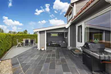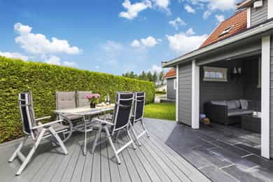 Fantastisk flott hjørnetomt som er pent opparbeidet med liten gressplen, støttemurer, prydbusker/trær, belegningsstein og asfalt. Eiendommen er meget barnevennlig og er pent innrammet med hekk og gjerde i tomtegrenser. Tomten er syd- og vestvendt, og har meget gode solforhold fra tidlig morgen til sen kveld. Det er anlagt en stor skiferlagt terrasse + 2 terrasser til, med plass til flere hyggelige utesoner, og koselig utestue. På denne eiendommen kan man nyte fine sommerdager!