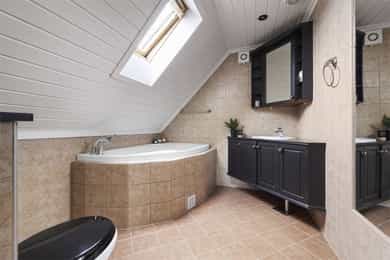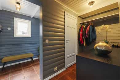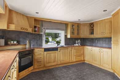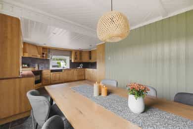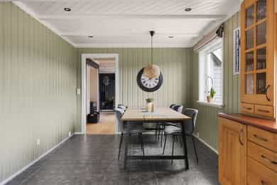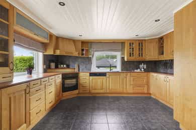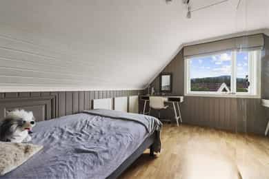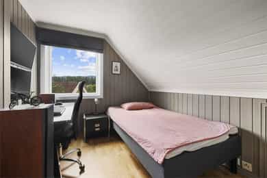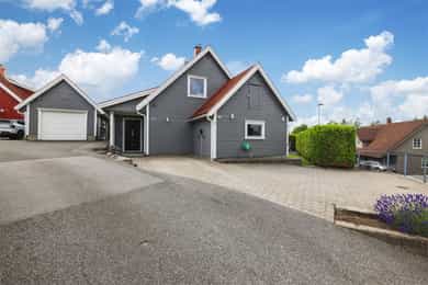 Pen familiebolig over to plan med praktisk planløsning i begge etasjer. 1. etasje inneholder en hyggelig entré med adkomst fra overbygget inngangsparti. I entréen er det flislagt gulv med varmekabler. Fra gangen er det inngang til 2 praktiske boder. Boligen har en meget romslig og innbydende stue med gode møbleringsalternativer. Varmepumpe og vedovn sørger for god oppvarming av denne etasjen. Store vindusflater gir godt med dagslys inn i boligen. Utgang fra stuen til et fantastisk hageområde med terrasse, utestue og hageområde. Fra stuen er det også inngang til hovedsoverom. Her kan man bo med alt på en flate om ønskelig. Kjøkkenet er romslig, med god plass til stort spisebord. Pen kjøkkeninnredning med profilerte fronter og overskap til tak. Det er rikelig med både oppbevaringsplass og arbeidsplass på dette kjøkkenet. Integrert stekeovn, koketopp, oppvaskmaskin, og kjøleskap medfølger. Fliser på vegg langs kjøkkenbenk. Fliser med varme i gulv. Romslig og pent flislagt bad med varme i gulv. Baderomsinnredning med overliggende servant, speil, belysning og sideskap. Dusjhjørne med innfellbare glassvegger og vegghengt dusjgarnityr. Vegghengt toalett. Badet ble pusset opp i 2009. Egen nisje med opplegg til vaskemaskin. 2. etasje inneholder en koselig loftstue som passer godt for barn/ungdom eller som en arbeidsplass for hjemmekontor. I denne etasjen Her finner du også tre soverom og baderom. Hovedsoverommet i denne etasjen har god plass til dobbeltseng og inneholder frittstående garderobeskap. De to andre soverommene benyttes i dag som barnerom. Lagringsplass i knekott. Baderommet har fliser på vegger og gulv, med varmekabler. Baderommet inneholder innfliset badekar, vegghengt toalett, og baderominnredning med enkel servant. Godt med lagringsplass i innvendige boder, knekott, loft, loft over garasje og loft over kjøkken med adkomst fra utsiden.