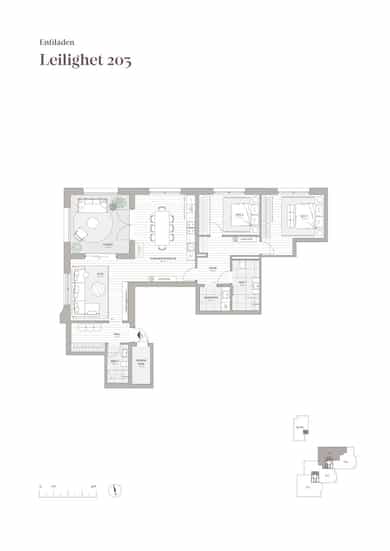 Leilighet 203 er en særdeles lekker hjørneleilighet med høy kvalitet i materialvalg og utforming. Leiligheten ligger i 2. etg med heisadkomst og har en lun, vestvendt loggia.