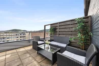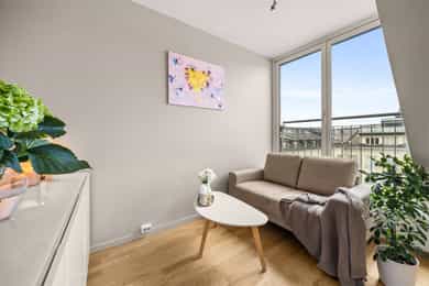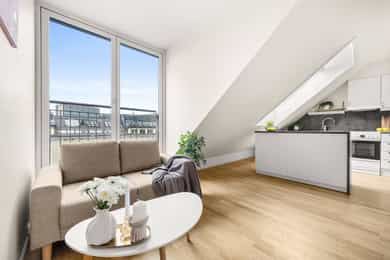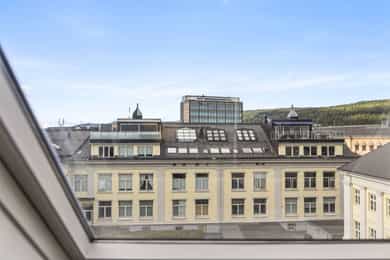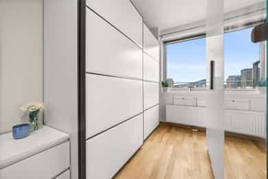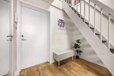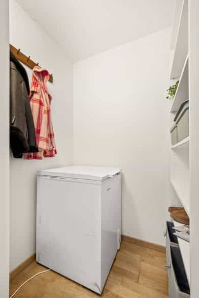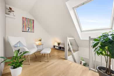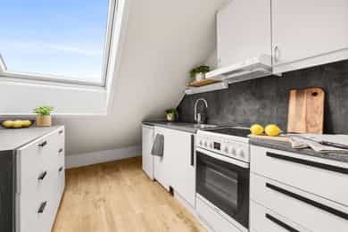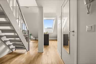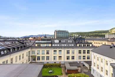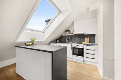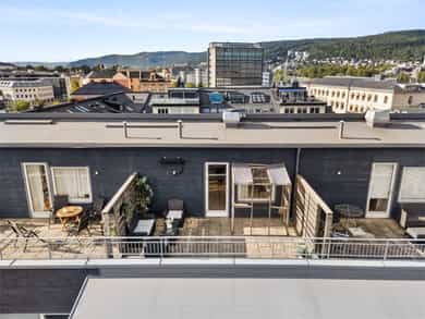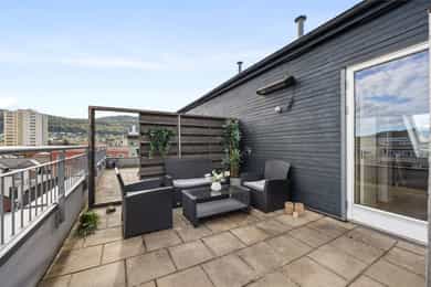 5. Etasje: Entré: Praktisk entré med plass for å henge av seg yttertøy og sko. Det er plass til kommode hvis man ønsker det. Stue/Kjøkken: Lys og fint oppholdsrom, med naturlig plass for sofagruppe og tilhørende tv-møblement. Åpen løsning til kjøkkenet. Leiligheten har et pent kjøkken med glatte fronter, benkeplate i laminat og praktisk kjøkkenøy. Kjøkkenet er utstyrt med hvitevarer som komfyr, kjøleskap og oppvaskmaskin som medfølger salget. Oppholdsrommet er lyst og pent med takvinduer som bidrar til godt med naturlig lys. Bod: Praktisk innvendig bod med plass for diverse lagring. 6. Etasje: Loftstue: I leilighetens øverste etasje finner du enda en stue. Loftstuen er i dag innredet med sittemøblement. Fra loftstuen er det videre adkomst til flott takterrasse på hele 19m2. Soverom: Soverom med plass for både dobbeltseng og garderobeskap. Det er innredet med både skyvedørsgarderobe og skap som gir gode oppbevaringsmuligheter. Bad: Flislagt bad med varmekabler i gulv. Badet er utstyrt med servant med underskap, speil med lys, dusjnisje og toalett. praktisk med nisje for oppvaskmaskin under skap for oppbevaring.