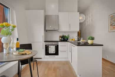 Integrerte hvitevarer på kjøkken medfølger. Integrerte hvitevarer: