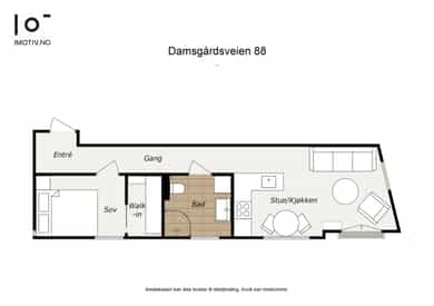 BRA-i: 44 kvm. Entré, gang, soverom, garderobe, bad og stue/kjøkken