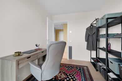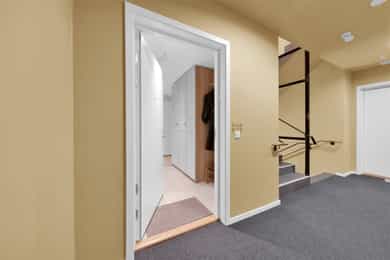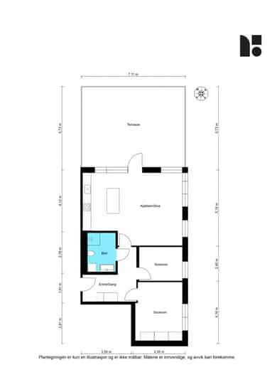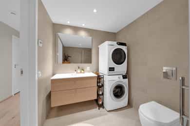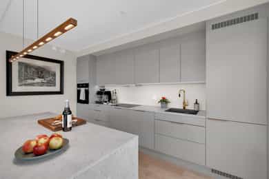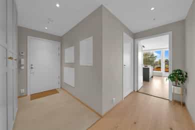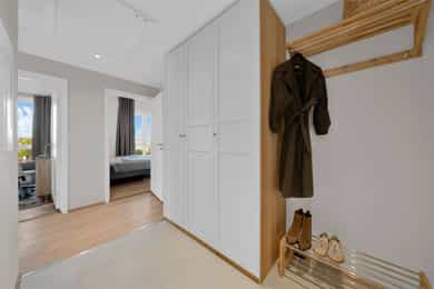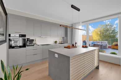 Entrè Entréen er flislagt og har behagelig gulvvarme som gir en lun velkomst, spesielt på kjølige dager. Her er det praktisk garderobeskap og oppheng for yttertøy, noe som gir gode oppbevaringsmuligheter og bidrar til et ryddig førsteinntrykk. Stue Stuen fremstår som lys og innbydende med store vindusflater som slipper inn rikelig med naturlig lys, samtidig som beliggenheten gir lite innsyn. Rommet har god plass til både sofa- og spisegruppe, og ligger i åpen løsning med kjøkkenet. En praktisk kjøkkenøy fungerer som en naturlig romdeler mellom sonene. Plassbygde gardinskinner med tilhørende gardiner medfølger og gir et helhetlig og gjennomført uttrykk. Kjøkken Kjøkkenet er utstyrt med stilren innredning fra HTH og har gode arbeidsflater og oppbevaringsløsninger. Det er integrert komfyr og platetopp fra Miele, samt kjøleskap og oppvaskmaskin fra Electrolux. Alle hvitevarer medfølger handelen. Kjøkkenøyen har integrert stikkontakt og gir både ekstra benkeplass og en sosial møteplass. Soverom Boligen har to soverom av god størrelse. Hovedsoverommet er utstyrt med garderobeskap. Baderom Badet er flislagt og har gulvvarme for ekstra komfort. Rommet er innredet med servant, toalett og dusj, og det er tilrettelagt med opplegg for både vaskemaskin og tørketrommel. Det gir en funksjonell og moderne løsning som dekker hverdagens behov.