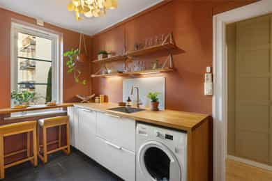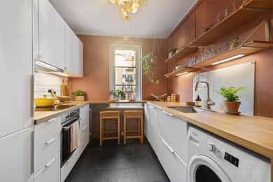 Lun, innbydende og gjennomført 3-r med to solrike balkonger - Kjøkken og overflater 2021/22 - Tilbaketrukket beliggenhet
