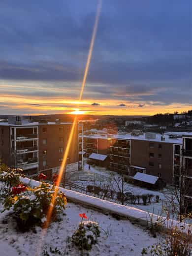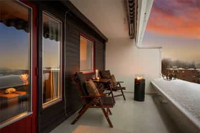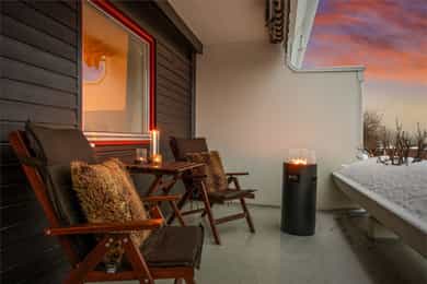 Leiligheten har gode solforhold med sol på verandaen fra soloppgang til ca. kl. 17 på sommerstid. På inngangssiden er det behagelig ettermiddagssol. Vinterstid har verandaen sol fra soloppgang og frem til ca. kl. 14.