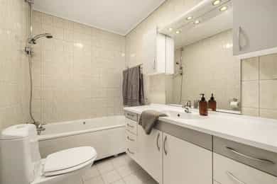 Vedlagt følger utdrag fra takstmannens rapport: Stor enebolig med gode utviklingsmuligheter, beliggende i et rolig og etablert boligstrøk med eneboliger fra tilsvarende byggeperiode. Kort vei til de fleste fasiliteter, samt gode turmuligheter rett utenfor døren. Boligen fremstår med relativt nye innvendige overflater, noe eldre bad, nyere kjøkken og oppgradert elektrisk anlegg/sikringsskap. Det må påregnes kostnader til oppgradering av bad og vaskerom i henhold til gjeldende krav og mangler knyttet til funksjonskravene. Taket ble kun delvis besiktiget på grunn av snøforhold, men glasert takstein har normalt lang levetid. Undertaket har noe kortere forventet brukstid. Utvendig fasade av teglstein har god levetid; normalt vedlikehold som vask og eventuell utbedring av fuger må påregnes. Tilstandsgrader er basert på retningslinjer i avhendingsloven, med bestemmelser i NS 3600:2018 og gjeldende byggeforskrifter. Avvik kan forekomme som følge av forskjeller mellom byggetidens forskriftskrav, dagens krav i TEK17 og krav til personsikkerhet. Utvendig Tak tekking av glasert enkeltkrummet teglstein. Nedløp og renner er av plastbelagt stål fra byggeåret. Yttervegg av bindingsverk 100 mm. Isolert med mineralull. Utvendig forseglet med teglstein, med luftet spalte mellom bindingsverk og fasade kledning. Takkonstruksjonen består av prefabrikkerte W-takstoler med valmet takform og en takvinkel på 22 grader. Undertaket er utført med rupanel. Loftsluken og adkomst til kaldt loft er fra garasjen. Taket er luftet gjennom gesimskasse ved takraft og sperrefot på alle vegger. Malte trevinduer med 2-lags glass fra byggeår, midthengslet. Vinduet i karnappet i stuen er sidehengslet i malt tre. Kjellervinduer er topphengslet og har 2-lags glass. Alle vinduene har utvendige smårutede sprosser. Malt ytterdør med kodelås og 2-lags smårutet glass. to-fløyet terrassedør med 2- lags glass til balkong fra soverom Hev skyvedør til utvendig terrasse fra kjøkken/spisestue. Overbygget balkong fra soverom med bjelkelag og åpent terrassebord gulv, fra byggeår. Fra kjøkken/spisestue er det tilgang til markterrasse. Tilgang til dobbel garasje via dør ved vaskerom/liten gang. Innvendig Alle gulv unntatt bad har hard presset eikeparkett med elektrisk gulvvarme på kjøkken, vaskerom og begge badene i 1. etasje. Entre, vaskerom, liten gang ut mot garasje og toalett har gulv som er mer tilpasset mulighet for vannsøl. Elektrisk gulvvarme i kjeller. Vegger med malte plater og himling av malte plater. Badene er med fliser på gulv og elektrisk gulvvarme, fliser på vegger og himling med malte plater. Teknisk rom i kjeller har malt betong på gulv , malte plater på vegger og malte plater i himling. Entre' med stor skyvedørsgarderobe. To soverom i 1. etasje og stort soverom i kjeller, med skyvedørsgarderobe. Garderobeskap i trapperom kjeller og uinnredet rom kjeller. Tekniske installasjoner er plassert på teknisk rom i kjeller (sikringsskap, stoppekran for vann). Åpen malt innvendig trapp i entre' fra byggeår. Glatte innvendige dører oppgradert ca. 2022. dører med glass har en ukjent alder men er funksjonstestet og fremstår uten skader. Antall TG 2 er 17 stykk og gjelder taktekking, nedløp og beslag, veggkonstruksjon, vinduer, dører, terrassedør, etasjeskille/gulv mot grunn, vannledninger, avløpsrør, varmesentral, fuktsikring og drenering, grunnmur og fundamenter, terrengforhold, utvendige vann- og avløpsledninger, overflater og konstruksjon toalettrom, overflater vegger og himling bad 1. etasje og sluk/membran/tettesjikt bad i kjeller. Antall TG 3 er 3 stykk og gjelder vaskerom 1. etasje, sluk/membran/tettesjikt bad 1. etasje og bad 2 i 1. etasje. Vi viser videre til tilstandsrapporten som er vedlagt denne salgsoppgaven, og som må leses i sin helhet før budgivning