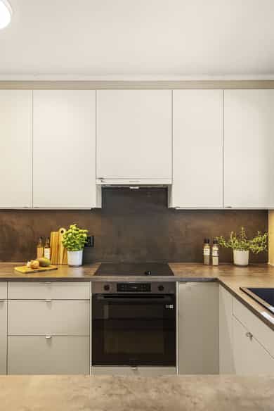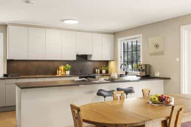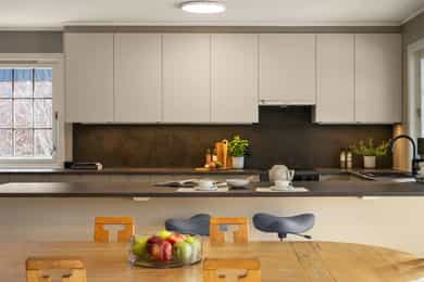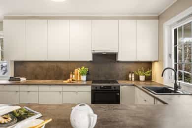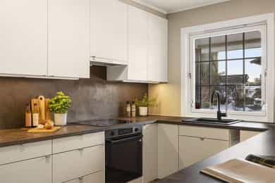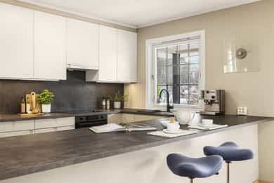 2022: Skiftet fronter på kjøkken og benkeplate på kjøkken og vaskerom.