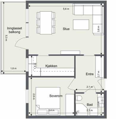 BRA-i: 47 kvm. Kjøkken, bad, entré, soverom, stue