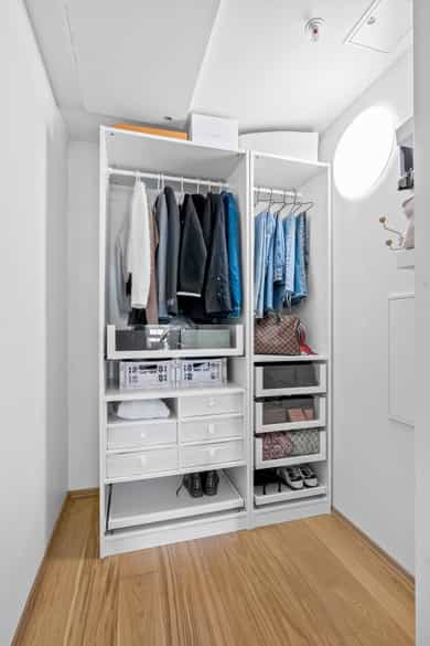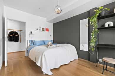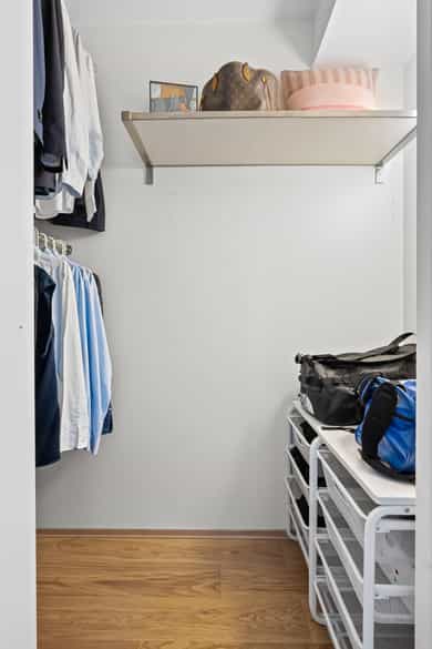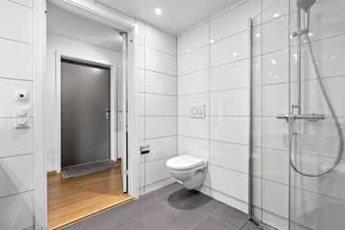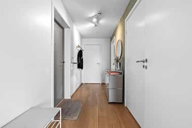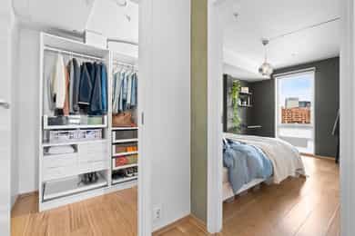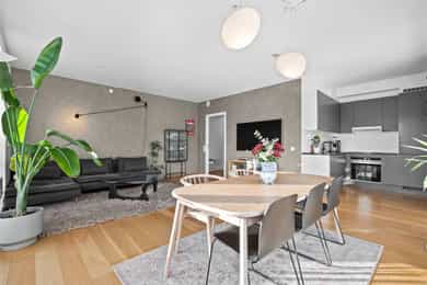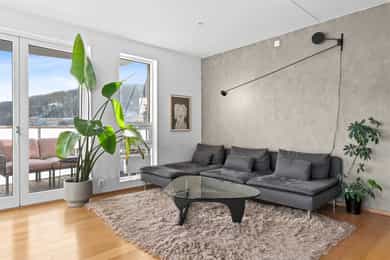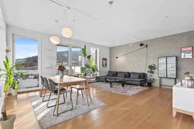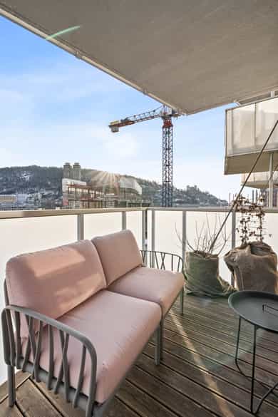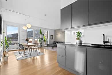 Entré Velkommen inn i en romslig og innbydende entré med god plass til både kommode, skoskap og knaggrekke. Her får du en praktisk og funksjonell løsning som gjør det enkelt å holde orden i hverdagen. I direkte tilknytning til gangen finner du en innvendig bod - perfekt for oppbevaring av yttertøy, sko og annet du ønsker lett tilgjengelig, men ute av syne. Stue | Kjøkken Boligen har en attraktiv hjørnebeliggenhet med store vindusflater fra flere vinkler, som gir et fantastisk lysinnslipp gjennom hele dagen. Her kan du nyte en imponerende utsikt uten innsyn, noe som gir en luftig og privat atmosfære. Den åpne planløsningen gjør det enkelt å innrede med tydelige soner for både sofagruppe og spiseplass. Her er det rikelig med plass til å skape et sosialt og hyggelig oppholdsrom, enten du inviterer gjester eller ønsker rolige kvelder hjemme. Fra stuen er det utgang til en luftig balkong på 6 kvm. Balkongen byr på gode solforhold, nydelig fjordutsikt og god plass til utemøbler og grill - et perfekt sted å nyte morgenkaffen eller sene sommerkvelder. Kjøkkenet har en stilren og tidløs innredning fra HTH med slette fronter. Benkeplaten i granitt (oppgradert i 2017) har nedfelt beslag og ett-greps blandebatteri. Kjøkkenet er godt utstyrt med integrert kjøl/frys, oppvaskmaskin, stekeovn og induksjonstopp, samt ventilator med mekanisk avtrekk og integrert komfyrvakt. Leiligheten har balansert ventilasjon som bidrar til et behagelig og sunt inneklima året rundt. Soverom Soverommet er romslig og har god plass til dobbeltseng og nattbord. I tillegg er det plass til både garderobeløsning og eventuelt skrivepult for deg som ønsker hjemmekontor. Rommet har også en praktisk garderobe/walk-in closet. Bad Badet fremstår lyst, moderne og tidløst med flislagte overflater og varmekabler i gulv som gir ekstra komfort. Innredningen består av heldekkende servant med underskap, speil og belysning. Videre finner du vegghengt toalett og dusj med dusjvegger i herdet glass. Balansert ventilasjon sørger for godt inneklima også her. Bod Leiligheten disponerer en romslig kjellerbod på ca. 5 kvm. Her er det rikelig med plass til oppbevaring av sesongutstyr, sportsutstyr og annet du ikke trenger i det daglige