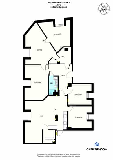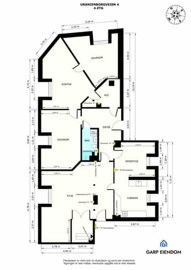 Leiligheten ligger i byggets 4. etasje og inneholder entré, stue, kjøkken, spisestue, 2 soverom, kontor og wc/omkledningsrom og bad. Takhøyden er målt til 3,18 cm i stuen. Kjellerbod (18 kvm gulvareal) i fellesarealer.