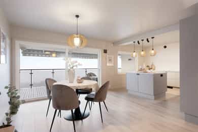 Pent opparbeidede fellesarealer med asfalterte stikkveier og overbygd inngangsparti ønsker velkommen. Vel inne er en romslig entré med plass til oppbevarings- og sittemøblement, samt porttelefon som gjør det enkelt å slippe inn besøkende. Leiligheten har fin og lys planløsning, og skjermet beliggenhet i blokkens 2. etasje. Boligen ble betydelig oppgradert i 2026 med gjennomgående slette overflater, flott gulv og gode oppbevaringsløsninger. Stuens avlange utforming gir rom til både sofaløsning adskilt fra kjøkken og spisestue. De store vindusflatene trekker en mot det flotte utsynet og slipper inn rikelig med naturlig lys. Skyvedøren fra 2026 gir en sømløs overgang og en forlengelse av stuen på sommerdagene. På 20 kvm balkong kan utsikten over Oslofjorden og all dens aktivitet nytes til det fulle, dag som kveld og alle årstider. Refsnes er vakkert hele året men sommeren gjør området helt spesielt, og med god grunn kjent for vakre solnedganger! Spisestuen ligger i åpen løsning mot det lekre HTH kjøkkenet fra 2026. Frontene er lyse og benkeplaten er av laminat. Hvitevarene er integrerte og består av oppvaskmaskin, platetopp, mikro, stekeovn og kjøl/frys. Det er godt med benkeplass og oppbevaringsplass, samt belysning. Badet ble renovert i 2026 og fremstår moderne med store fliser på vegger og gulv, sorte detaljer, gulvvarme og downlights. Rommet har dusjhjørne med glassdører og regnfallsdusj. Videre er det innredet med vegghengt toalett, skuffeinnredning og dobbel vask. Det er også opplegg for vaskemaskin/tørketrommel. Leiligheten har to soverom, alle plassert i østre del av leiligheten. Originalt var det tre soverom, og det kan med enkle grep tilbakeføres. Soverommene er malt i behagelig gråtone. Hovedsoverommet er størst, med plass til dobbeltseng med tilhørende møblement og tilgang til omkledningsrom for enkelt å holde orden i klær og tilbehør. For lagring og oppbevaring disponerer leiligheten en bod i fellesareal. Innvendige overflater: - Vegger med slettmalte overflater og fliser. - Gulv med laminat og fliser. - Slettmalte overflater i himling. Tekniske installasjoner: - Vannledninger i boligen utørt i plast i rør-i-rør system. Stoppekraner er tilgjengelig i rørskap. Avløpsrør av plast. - Bolig ventilert ved ventiler i vegger og vinduer, mekanisk på baderom. - Boligen er elektrisk oppvarmet. Varmefordeling med gulvvarme på bad. - Bereder er plassert i kjøkkenbenk, det er montert vannstoppesystem.