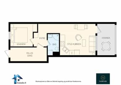 BRA-i: 33 kvm. Entré, kjøkken/stue, soverom, bad