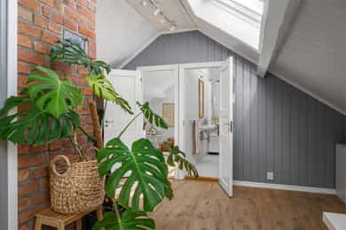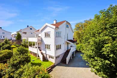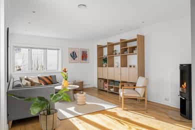 Entréen er romslig og innbydende og gir et godt førsteinntrykk, med direkte adkomst til spisestuen som naturlig binder etasjen sammen. I andre etasje ligger en stor og lun stue med fjordutsikt. Lyse, tidsriktige farger skaper en moderne og harmonisk atmosfære. Her er det god plass til både sofagruppe og spisebord, noe som gjør rommet ideelt for både hverdagsliv og sosiale sammenkomster. Stuen er utstyrt med vedovn som gir effektiv oppvarming og skaper en lun og hyggelig atmosfære på kjølige dager. Fra stuen er det utgang til en skjermet balkong med behagelig formiddagssol. Kjøkkenet er adskilt fra stuen og holder moderne standard med lyse fronter, rene linjer og integrerte hvitevarer. Løsningen er både stilren og funksjonell, med rikelig benke- og skapplass samt plass til et lite frokostbord. Badet i samme etasje fremstår tidløst med mikrosement på gulvet og er utstyrt med dusjkabinett, toalett, servant i seksjon og opplegg for vaskemaskin. Fra badet er det direkte adkomst til hovedsoverommet, som har god størrelse og plass til garderobeskap. Etasjen har parkett på alle gulv, med unntak av badet. Loftsetasjen inneholder ytterligere ett soverom, en hyggelig loftstue med plass til TV-krok, et hobbyrom samt bad. Det er montert brannstige på yttervegg både fra soverommet samt hobbyrommet fra loftsetasjen. Badet har fliser på gulv og er innredet med toalett, servant og badekar med dusjmulighet. Det gjøres oppmerksom på at badene har fått TG3 i tilstandsrapporten som en følge av alder, men også grunnet faren for følgeskader ved en evt lekkasje. Det er ellers god plass til ekstra lagring i kneveggene på loftsetasjen. Hagen er lun og skjermet, og fungerer som et trivelig fellesområde med gode muligheter for lek og moro. Her finnes plass til sittegruppe for avslapning og sosiale sommerdager, i tillegg til frukttrær og bærbusker som skaper en frodig og hyggelig uteplass. Området er inngjerdet og gir en trygg og privat atmosfære. Det er en bod på 5 kvm i kjeller. Det er et fellesrom i kjeller som har god plass til sykler, dekk, kjelker osv. Ved inngangen i kjelleren oppbevares felles hageredskaper. Innvendige overflater: Innvendig er det gulv av parkett. Veggene har malte plater. Innvendige tak har malte plater. Etasjeskiller er av trebjelkelag. Det er foretatt stikkprøver mtp høyde avvik. Med stikkprøver menes noen rom/deler av etasjen. Det vil mao kunne være avvik uten at dette har blitt målt. I de tilfellene der det ikke er avvik over 15mm blir ikke målinger beskrevet i rapporten ettersom det ikke ansees som ett avvik ihht NS3600. Pipe med vedovn. Pipen er av eldre dato og kan ha skjulte feil eller mangler som først registreres av feier ved årlig kontroll, eller av murer i forbindelse med montering av ovn. Funksjon og pipeløp er ikke kontrollert i denne rapporten. I boliger hvor pipen går gjennom flere seksjoner kan det være feil med pipen som ikke lar seg kontrollere. På generelt grunnlag anbefales det alltid ytterligere kontroll av feier eller annet egnet firma. Boligen har malt tretrapp. Innvendig har boligen malte fyllingsdører. Teknisk: Innvendige vannledninger er av kobber. For nærmere kontroll av rør(faglig, teknisk og lovlighet) må rørlegger kontaktes(Se også tekst under "Gjelder spesielt for denne rapporten"). Etablert stakeluke er ikke lokalisert. Staking kan også utføres via de fleste sluker eller fra avløpsrør via vannlås. Avløpsrør er bygget inne i vegg(utenom ett) og er derfor ikke kontrollert. Tilstandsgrad er kun satt med bakgrunn i alder. Boligen har naturlig ventilasjon. Varmtvannstanken er på ca. 200 liter.