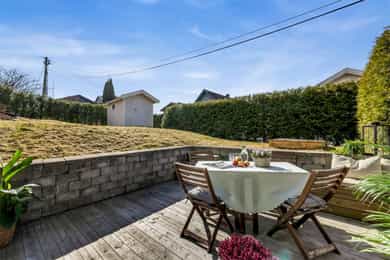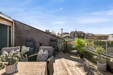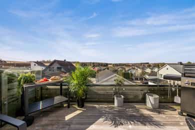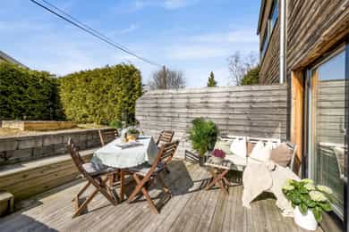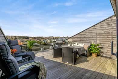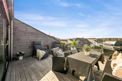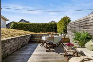 Terrassen er ca. 15 kvm, har dekke av terrassebord og levegg mot nabo. På veggen er det utebelysning og vannkran. Boligen har også en flott takterrasse på ca. 25 kvm med utgang fra stuen på øverste plan. Levegger på to sider gir fin skjerming og glassrekkverk i front gir uhindret utsikt over landskapet. Det er god plass til utemøbler både markterrassen og takterrassen, og begge har gode solforhold.