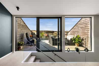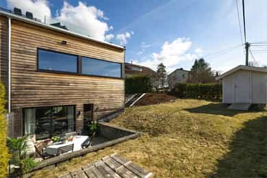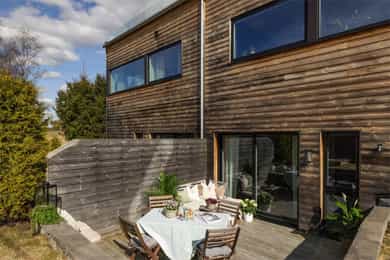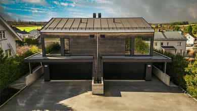 ½-part av lekker "funkis" tomannsbolig fra 2018 -Garasje, mark- og takterrasse. Landlig utsikt, nær skole, buss og tog.