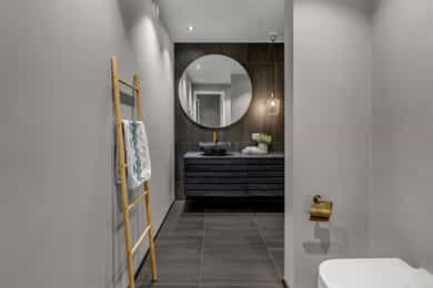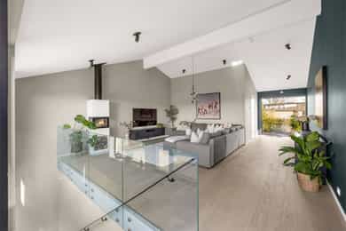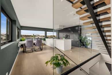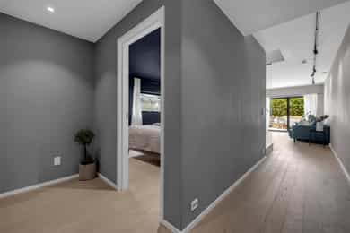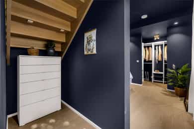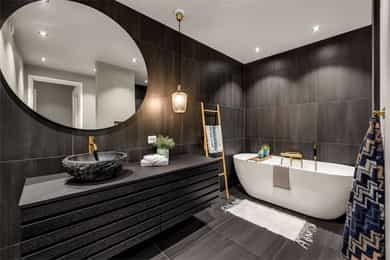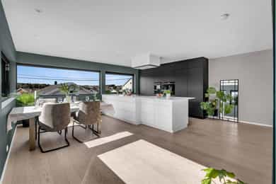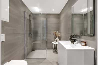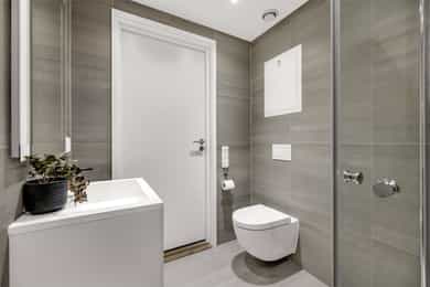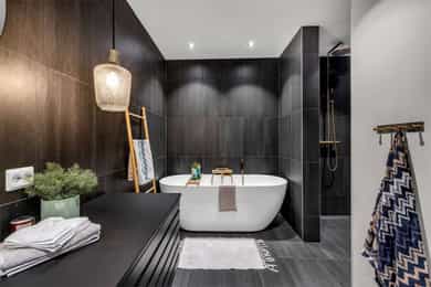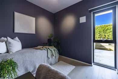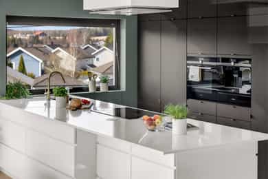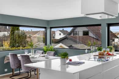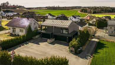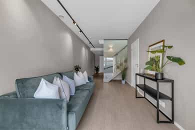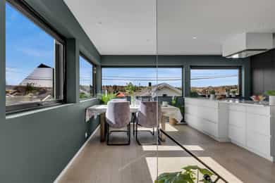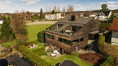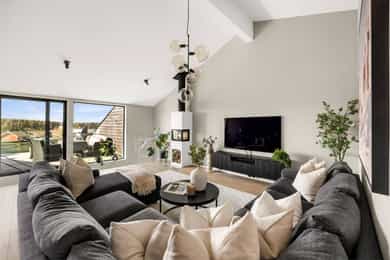 Kort fortalt: - Lekker halvpart av tomannsbolig. - Vertikaldelt over tre etasjer. - Moderne standard fra 2018. - Fasade i lerk med sort staffasje. - Integrert garasje, asfaltert gårdsplass. - Skjermet hage med plen og busker. - Lun markterrasse på ca. 16 kvm. - Luftig takterrasse på ca. 25 kvm. - Vidstrakt utsikt over landskapet. - Entré med skyvedørsgarderobe. - Kvik-kjøkken med integrerte hvitevarer. - God plass til spisebord på kjøkken. - Stue med flott takhøyde og peis. - Kjellerstue med skyvedør til terrasse. - 3(4) soverom - Walk-in closet og garderobedel. - To delikate bad og et vaskerom. - Badekar og regnfallsdusj på ett bad. - Lagringsplass i bod på takterrassen og en praktisk innvendig bod i gangen. Det er også mye god lagring i garasjen og i skur i hagen. - Balansert ventilasjon for sunt inneklima. - Varmekabler i alle gulv med unntak av innvendig bod og garasjen - 1. ETASJE - ENTRÉ: Boligen har overbygd inngangsparti på siden og direkte inngang fra garasjen til entreen. Entreen har grå gulvfliser, gråmalte vegger og hvitmalt himling med downlights. Listefri overgang til tak understreker de rene linjene som kjennetegner boligen. En takhøy skyvedørsgarderobe med speilfronter og sort omramming gjør det enkelt å holde orden på yttertøy og sko. Det er direkte adkomst til den integrerte garasjen fra entréen, noe som gir en praktisk og enkel hverdag. KJØKKEN: Kjøkkenet ligger i første etasje og har god plass til et større spisebord. Gode vindusflater fyller rommet med dagslys fra to sider og gjør spiseplassen ekstra hyggelig. Innredningen fra Kvik er plassert langs én vegg og har en stor kjøkkenøy mot spisesonen. Ved deler av kjøkkenøya er det barløsning med spiseplasser. Skapene langs veggen går fra gulv til tak, har matte, sorte fronter og integrerte hvitevarer som kjøl/frys, stekeovn med pyrolyse og micro, oppvaskmaskin og kaffemaskin. Kjøkkenøya har kolonialskuffer med hvite fronter og freste grep, samt tynn, hvit benkeplate med underlimt vaskekum og keramisk koketopp. Avtrekksvifte over kokeplass. Det hele er strømlinjeformet, minimalistisk og stilig - helt i tråd med boligens uttrykk. INNVENDIG BOD: Smart innredet rom med garderobeløsning og dagslys, som gir fleksibel bruk – perfekt som både walk-in garderobe og hjemmekontor med gode oppbevaringsmuligheter. BADEROM: Delikat, flislagt baderom med elektrisk gulvvarme og downlights i himlingen. Innredningen består av en heldekkende servant på hvitt servantskap, speil med integrert belysning, et veggmontert toalett og en stort dusjhjørne med glassdører, regnfallsdusj og hånddusj. Det er balansert ventilasjon. - 2. ETASJE - LYS OG LUFTIG STUE M/UTGANG TIL TAKTERRASSE: Stuen er lys og luftig, med store vindusflater på to sider som gir rikelig med naturlig lys. Planløsningen åpner for flere møbleringsmuligheter, med god plass til sofagruppe, TV-møblement og spisebord med tilhørende stoler. Gulvet er belagt med flott 1-stavs parkett, og overflatene er malt i delikate og moderne fargetoner – et ideelt utgangspunkt for å skape et personlig og innbydende hjem. Stuen i andre etasje nås via et stilrent trapperom med glassvegger, sort håndløper i stål og trinn i eik, som gir et moderne og luftig uttrykk. Ved gavlveggen er det installert en elegant peis med glass på tre sider, som gir et flott flammebilde og bidrar til en lun og eksklusiv atmosfære. Peisen er hvit, tilkoblet stålpipe og har glassplate foran. Fra stuen er det utgang til en fantastisk takterrasse på ca. 25 m² med svært gode solforhold og vidstrakt utsikt. Terrassen byr på rikelig med plass til både loungeområde, spisegruppe og grønne innslag, og fremstår som en sjelden og privat uteplass med gode solforhold gjennom dagen – perfekt for både rolige stunder og sosiale sammenkomster. SOVEROM: Soverommet er romslig, med plass til dobbeltseng, nattbord og tilhørende møbler. - UNDERETASJE - KJELLERSTUE M/ADKOMST TIL PLATTING: Boligen har også en koselig kjellerstue - et uvurderlig rom for familier som trenger ekstra spillerom og privatliv. Stuen har lysmalte vegger med listefri overgang til tak, enstavs parkettgulv og store skyvedør i glass ut mot hagen. Fra kjellerstuen er det utgang til en herlig og lun terrasseplatting på ca. 16 m². Uteplassen fremstår som skjermet og innbydende, med gode muligheter for å etablere sittegrupper, beplantning og grill. Dette gir en fin forlengelse av oppholdsrommet og legger til rette for hyggelige stunder utendørs. TRE SOVEROM: Underetasjen inneholder to (tre) romslige soverom med god plass til seng, garderobeløsninger og øvrig møblement. Rommene har fleksible bruksområder og egner seg godt som barnerom, gjesterom eller hjemmekontor, tilpasset ulike behov. Hovedsoverommet har direkte adkomst til en romslig walk-in-garderobe, som gir gode oppbevaringsmuligheter. Det er åpnet opp vegg mellom barnerommet og hovedsoverommet, derfor anføringen 2(3) soverom. Boligens opprinnelige løsning hadde ikke denne åpningen og byggetegningene er da registrert med 3 romslige soverom i u.etajsen. Man kan lett tette igjen åpningen mellom rommene om man ønsker et separat barnerom. BADEROM: Lekkert, flislagt baderom med elektrisk gulvvarme og downlights i himlingen. Her er det badekar i egen nisje og regnfallsdusj i nisje ved siden av. Armaturene er i messing, både på badekar, hånddusj og regnfallsdusj. Innredningen består av en lekker, sort skuffeseksjon med sort benkeplate og bolleservant i stein med kran i messing. Videre er det stort, rundt speil over servanten og veggmontert toalett i egen del av rommet. Det er balansert ventilasjon. VASKEROM: Vaskerommet ligger i kjelleren og er praktisk innredet med fliser på gulv, lysmalte vegger og smart innredning. Her er det grå benk med nedfelt vaskekum, hvite skap og hyller. Det er nisje for vaskemaskin og tørketrommel i god arbeidshøyde. Det er elektrisk gulvvarme og balansert ventilasjon. Teknisk kabin med sluk. Det er t