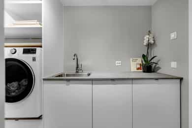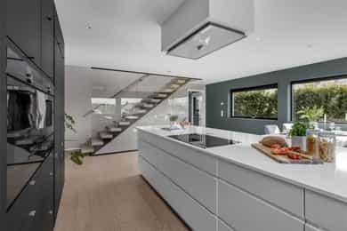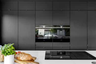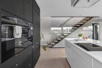 Integrerte hvitevarer medfølger, herunder kombinert kjøl/frys, stekeovn/mikro, kaffemaskin og platetopp.