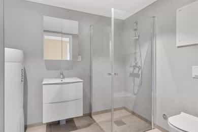 SANITÆR-INNREDNING-DIVERSE: Toalett med integrert sisterne og Soft Close toalettsete Dusjbatteri med garnetyr (Krom) Dusjdører 90x90 (Krom) Servant lind delight hvit 60cm med tilhørende speilskap Blandebatteri (Krom).