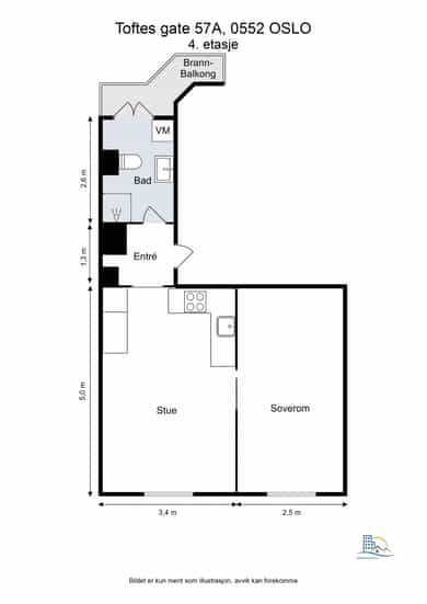 BRA-i: 38 kvm. Entré, bad, soverom, kjøkken og stue.