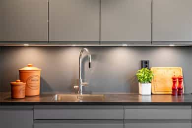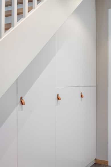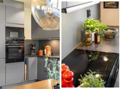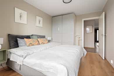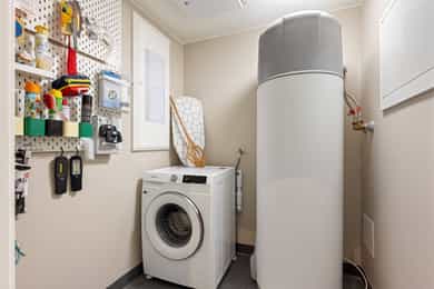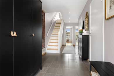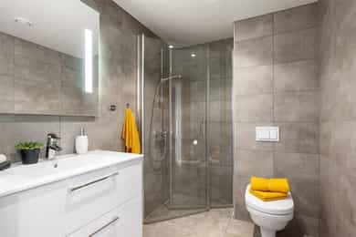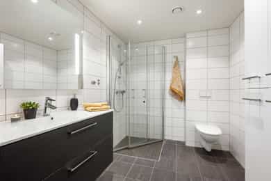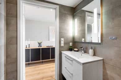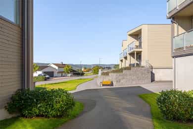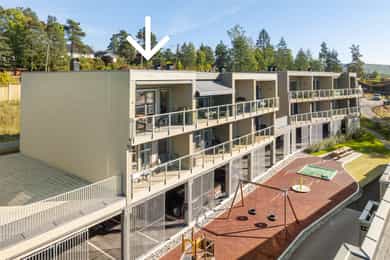 Entré Entréen har mørke fliser på gulvet og behagelig gulvvarme. Veggene har pusset og malt overflate, og himlingen er malt med innfelte downlights som gir god belysning. Det er god oppbevaringsplass i garderobeskap, og under trappen er det praktisk plassbygd lagring. Stue Stuen er lys og innbydende med store vindusflater som og gir en fin utsikt. Det er 1-stavs laminatgulv, malte vegger og himling med downlights. Peisen bidrar med både varme og hygge på kjølige dager. Fra stuen er det utgang til en sydvestvendt og overbygget balkong på ca. 9 kvm – et herlig uterom hvor du kan nyte solen store deler av dagen. Rommet har god plass til sofagruppe. Kjøkken og spisestue Kjøkkenet er moderne og elegant med HTH-innredning i gråtoner og glatte fronter med innfelte håndtak. Den mørke laminatbenkeplaten med nedfelt stålvask og lekkert blandebatteri gir et gjennomført preg. Her finner du alt du trenger av integrerte hvitevarer - kjøleskap og fryser i full høyde, oppvaskmaskin, stekeovn, mikro og induksjonstopp, samt avtrekksvifte, komfyrvakt og lekkasjestopper. Rommet har god plass til spisebord og store vindusflater som slipper inn rikelig med dagslys. Bad i 2. etasje Badet i 2. etasje er stilfullt innredet med grå fliser på vegger og gulv, samt mosaikkfliser i den nedsenkede dusjsonen. Himlingen er malt og har innfelte downlights, og gulvvarme sørger for ekstra komfort. Rommet er utstyrt med veggmontert toalett, dusjhjørne med glassdører og dusjbatteri fra Oras, mekanisk avtrekk samt servantskap med hvite høyglansfronter og keramisk servant med ettgreps blandebatteri. Soverom Boligen har tre soverom, alle praktisk plassert i 1. etasje. Rommene har 1-stavs laminat på gulv samt pusset og malt overflate på både vegger og himling. Hovedsoverommet har god plass til dobbeltseng, garderobeskap og utgang til balkong. Ett av rommene er innredet med en plassbesparende skapseng som kan felles ned ved behov – en smart løsning som gir fleksibel bruk og optimal utnyttelse av plassen. Det tredje rommet egner seg godt som barnerom. Bad i 1. etasje Badet i 1. etasje har et moderne uttrykk med mørke fliser på gulvet og mosaikkfliser i den nedsenkede dusjsonen. Veggene er kledd med hvite fliser, og himlingen er malt og har innfelte downlights som gir god belysning. Det er gulvvarme og mekanisk avtrekk. Rommet er utstyrt med veggmontert toalett, dusjhjørne med glassdører og dusjbatteri fra Oras. Innredningen består av høyskap med hvite høyglansfronter og servantskap med mørke, glatte fronter og hvit keramisk servant med ettgreps blandebatteri i rustfritt stål. Teknisk rom Teknisk rom med varmtvannsbereder og opplegg for vaskemaskin. Rommet har praktiske veggløsninger for oppbevaring av utstyr og rengjøringsartikler. Dette er et funksjonelt rom som samler viktige tekniske installasjoner på ett sted. Lagringsplass Boligen disponerer en bod i garasjen på ca 7 kvm.