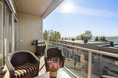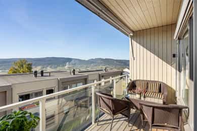 Boligen har to flotte, overbygde balkonger som begge vender mot sørvest. Balkongen i 1. etasje er på ca. 7 kvm, mens den i 2. etasje er på ca. 9 kvm. Begge er utført med impregnerte terrassebord og har moderne glassrekkverk med aluminiumsstolper. Her kan du nyte både måltider og rolige stunder utendørs, samtidig som du har en fin utsikt over nærområdet og grønne omgivelser.