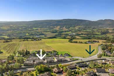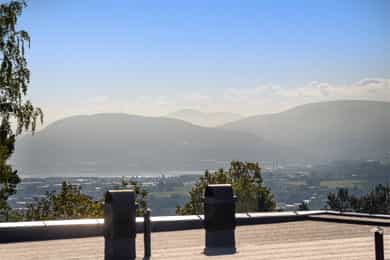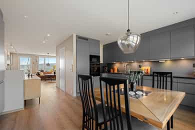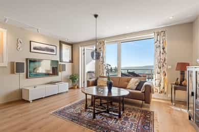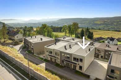 Påkostet enderekkehus fra 2022 med utsikt, 3 soverom, 2 bad, stilrent HTH-kjøkken og 2 garasjeplasser. Ingen dok.avg.