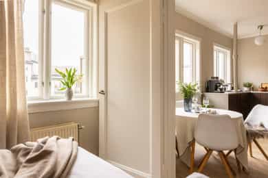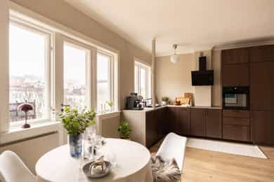 Velkommen til Bygdøy allé 70 - En smakfull, arealeffektiv og innbydende leilighet i 6. etasje. Leiligheten har en praktfull beliggenhet på fasjonable Frogner med kort vei til flere parker, butikker, gode kollektivmuligheter og hyggelige handlegater. - Delikat kjøkkeninnredning fra 2025 med integrerte hvitevarer, inkludert vaskemaskin - Balkong på 2 kvm med morgensol og formiddagssol (ca. 07–14 sommerstid) - Åpen stue- og kjøkkenløsning med godt lys fra vinduer mot stille bakgård - Alle overflater malt i lyse, delikate farger og nytt gulv lagt i 2025 - Gode lagringsmuligheter i medfølgende bod på 2 kvm - Nærhet til fjorden med bademuligheter - Beliggenhet i 6. etasje med flott utsikt - Parkeringsmuligheter i gatene utenfor